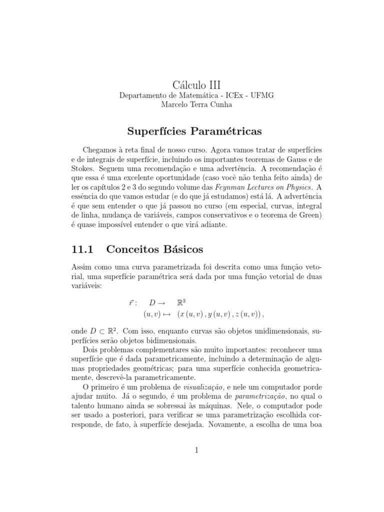 Chegamos ` a reta nal de nosso curso. Agora vamos tratar de superf cies e de integrais de superf cie, incluindo os importantes teoremas de Gauss e de Stokes. Seguem uma recomenda c ao e uma advert encia. A recomenda c ao e que essa e uma excelente oportunidade (caso voc e n ao tenha feito ainda) de ler os cap tulos 2 e 3 do segundo volume das Feynman Lectures on Physics . A ess encia do que vamos estudar (e do que j a estudamos) est a l a. A advert encia e que sem entender o que j a passou no curso (em especial, curvas, integral de linha, mudan ca de vari aveis, campos conservativos e o teorema de Green) e quase imposs vel entender o que vir a adiante.