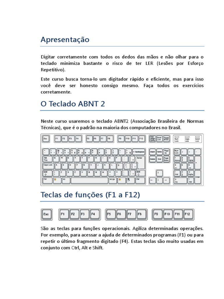 Digitar corretamente com todos os dedos das mos e no olhar para o teclado minimiza bastante o risco de ter LER (Leses por Esforo Repetitivo). Este curso busca torna-lo um digitador rpido e eficiente, mas para isso voc deve ser honesto consigo mesmo. Faa todos os exerccios corretamente.