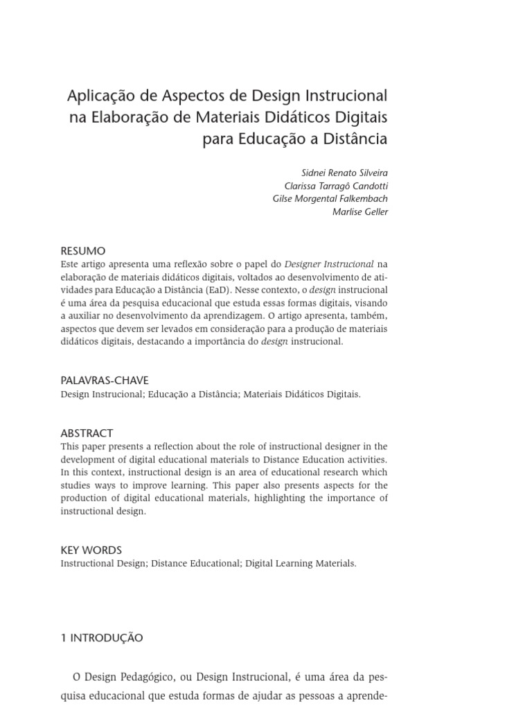 SILVEIRA, Sidnei Renato; CANDOTTI, Clarissa Tarragô; FALKEMBACH, Gilse Morgental; GELLER, Marlise. Aplicação de Aspectos de Design Instrucional na Elaboração de Materiais Didáticos Digitais para Educação a Distância. Revista D. Porto Alegre, n. 3, p. 77-96, 2011.