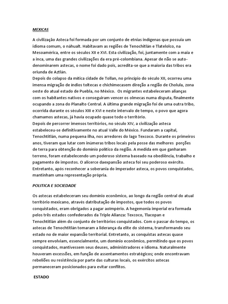 A civilizao Asteca foi formada por um conjunto de etnias indgenas que possuia um idioma comum, o nhualt. Habitavam as regies de Tenochitln e Tlatelolco, na Mesoamrica, entre os sculos XII e XVI. Esta civilizao, foi, juntamente com a maia e a inca, uma das grandes civilizaes da era pr-colombiana. Apesar de no se autodenominarem astecas, o nome foi dado pois, acredita-se que a maioria das tribos era oriunda de Aztln. Depois do colapso da mtica cidade de Tollan, no princpio do sculo XII, ocorreu uma imensa migrao de ndios toltecas e chichimecasem direo a regio de Cholula, zona oeste do atual estado de Puebla, no Mxico. Os migrantes estabeleceram alianas com os habitantes nativos e conseguiram vencer os olmecas numa disputa, finalmente ocupando a zona do Planalto Central. A ltima grande migrao foi de uma outra tribo, ocorrida durante os sculos XIII e XVI e neste intervalo de tempo, o povo que agora chamamos astecas, j havia ocupado quase todo o territrio. Depois de percorrer imensos territrios, no sculo XIV, a civilizao asteca estabeleceu-se definitivamente no atual Valle do Mxico. Fundaram a capital, Tenochtitln, numa pequena ilha, nos arredores do lago Texcoco. Durante os primeiros anos, tiveram que lutar com inmeras tribos locais pela posse das melhores pores de terra para obteno do domnio poltico da regio. A medida em que ganharam terreno, foram estabelecendo um poderoso sistema baseado na obedincia, trabalho e pagamento de impostos. O alicerce daexpanso asteca foi seu poderoso exrcito. Entretanto, aps reconhecer a soberania do imperador asteca, os povos conquistados, mantinham uma representao prpria. POLITICA E SOCIEDADE Os astecas estabeleceram seu domnio econmico, ao longo da regio central do atual territrio mexicano, atravs datributao de impostos, que todos os povos conquistados, eram obrigados a pagar aoImprio. A hegemonia imperial era formada pelos trs estados confederados da Triple Alianza: Texcoco, Tlacopan e Tenochtitln alm do conjunto de territrios conquistados. Com o passar do tempo, os astecas de Tenochtitln tomaram a liderana da elite do sistema, transformando seu estado no de maior expanso territorial. Entretanto, as conquistas astecas quase sempre envolviam, essencialmente, um domnio econmico, permitindo que os povos conquistados, mantivessem seus deuses, administradores e idioma. Naturalmente houveram excesses, em funo de assentamentos estratgicos; onde encontravam rebelies ou resistncia por parte das culturas locais, os exrcitos astecas permaneceram posicionados para evitar conflitos. ESTADO