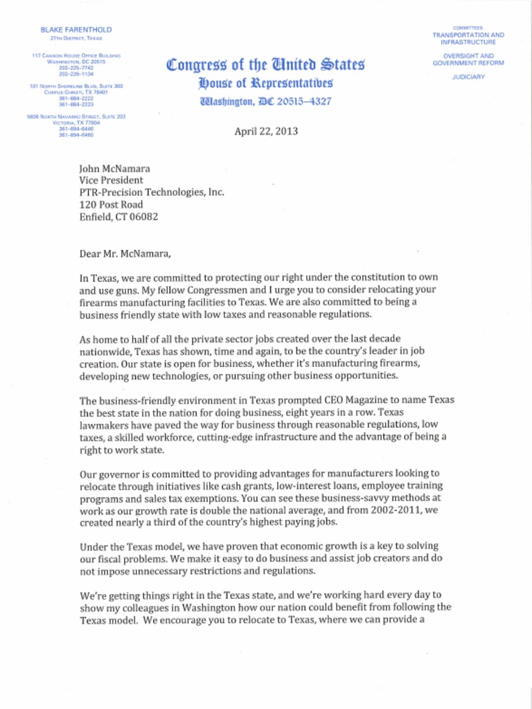 U.S. Representative Blake Farenthold (R-27), joined by ten members of the Texas Congressional Delegation, sent a letter today to three Connecticut gun manufacturers urging them to consider r…Descrição completa