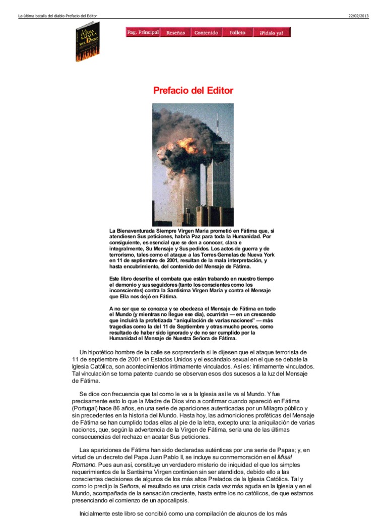 en las circunstancias actuales es el foro público el único abierto a los católicos que buscan la solución a las justas quejas que afectan a toda la Iglesia. con la autorización de los respectivos autores. basta recordar los recientes (y casi frenéticos) esfuerzos de ciertos funcionarios del Vaticano para “deconstruir” y “desmitificar” a Fátima.devilsfinalbattle. poco después. o si hemos cometido alguna injusticia. Así. de tal suerte que se pudiera obtener una obra distinta de todo lo anteriormente publicado sobre Fátima. para http://www. Paul Kramer y el Equipo de redacción de The Missionary Association remodelaron aquellos textos y declaraciones (incluyendo muchas otras informaciones). la milagrosa Conversión de Rusia al Catolicismo y el subsiguiente Triunfo de Su Corazón Inmaculado. se hallan reunidas en las Apariciones de Fátima. En el cumplimiento del Mensaje de Fátima radica el final de estas crisis paralelas. Por eso. mientras sus posibles sucesores promueven intrigas para lograr una posición ventajosa en el próximo cónclave. la verdad puede evitar una catástrofe mundial. A aquellos que nos dicen que es escandalosa nuestra intención de divulgar la campaña de esos destacados miembros contra Fátima. Y hasta los no católicos y aquéllos que no creen viven bajo el temor de la aniquilación de varias naciones. Es necesario asimismo comprender el perturbador y sistemático esfuerzo llevado a cabo por ciertos miembros de la Iglesia Católica. o en las conclusiones. Sin embargo. especialmente cuando. además de proporcionarles una distribución más amplia.» Rusia no se convirtió. se esperaba que se conservarían por más tiempo en los estantes de las librerías. preciso y sobrio. incluso la Consagración de Rusia al Corazón Inmaculado de María. Sin embargo. el lector nos debería presentar. debido al previsible fallecimiento del Papa. que traerá al Mundo un período de Paz. con objeto de no ofender a algunos elementos extraños a la Iglesia: en especial a los Ortodoxos Rusos. Durante el proceso de evaluación y complementación de esos materiales. lo cual les daría una cohesión plena. como si hubiera sido indicado por la Providencia. en el combate que actualmente asola a la Iglesia y al Mundo. Los asombrosos acontecimientos de Fátima no han sido un fútil espectáculo. sucedió algo muy notable: hubo un tema que surgió y se impuso por sí mismo. o en la argumentación. formulados en privado durante más de cinco años. como en este caso. el P. implicados en esta campaña contra Fátima. y. demostrando claramente su grave responsabilidad en las crisis eclesiástica y mundial que a todos nos afectan. con la solicitud de una madre. Los buenos serán martirizados. No hay paz.com/span/prefaciodeleditor. En este preciso momento existe una tácita expectación de vigilia. Si por acaso nos hemos equivocado con relación a algunos hechos. todos ellos han sido estériles. Repitiendo las palabras del Papa San Gregorio Magno. si no. a lo largo de muchas décadas.La última batalla del diablo-Prefacio del Editor 22/02/2013 esos trabajos en un volumen. discursos y conferencias en un volumen. cuya implacable oposición a Roma es más intensa que nunca. en gran parte. del tema del Mensaje de Fátima. de los escándalos sexuales causados por miembros del Clero. De su incumplimiento derivan. el origen y el incremento de ambas. bajo un tema único.html 2/3 . se sustituyó esa idea por otra mejor: reeditar los artículos. no se puede comprender el actual estado de la Iglesia y del Mundo sin que se comprenda lo que ocurrió en Fátima. Como lo demuestra el encubrimiento. indicado por el Cielo. aquellos que rodean a un Papa cada vez más debilitado lo muestran efectivamente incapaz de corresponder a los ruegos formulados tanto por miembros del Clero como por laicos. Las páginas siguientes ofrecen las pruebas de la actuación de algunos de los más prominentes miembros de la Iglesia. y que con toda conciencia creen que el camino que mantienen todavía ciertos líderes eclesiásticos es un camino extremadamente erróneo. como se lo pueden demostrar a cualquier observador objetivo los recientes acontecimientos. promoviendo guerras y persecuciones a la Iglesia. pues. después de 40 años de un estéril “diálogo ecuménico” con representantes del Vaticano. puesto que Dios no promueve espectáculos inútiles. de un modo celestial. Para demostrar la fundamental importancia de Fátima en el esquema de los actuales acontecimientos mundiales. Ambas crisis – la de la Iglesia y la del Mundo – se concentran en torno de las Verdades divinas que. y también al de nuestros lectores. esparcirá sus errores por el Mundo. Sometemos esta obra al dictamen del Papa. el Santo Padre tendrá que sufrir mucho. es preferible que se produzca un escándalo a ocultar la verdad. Lo que nos mueve a presentar este libro es la lealtad de hijos e hijas de la Iglesia. les responderemos tan sólo con las palabras de la misma Santísima Virgen: «Si atendieran Mis peticiones. con el propósito de obstruir el cumplimiento de los imperativos celestiales del Mensaje de Fátima. Sus errores – incluso el holocausto del aborto “legalizado” – se han difundido por el mundo entero. bajo diversos ángulos. varias naciones serán aniquiladas. Al tratar. que conocen y aman su Fe. Lo hacemos públicamente porque los numerosos pedidos a las altas autoridades eclesiásticas. Rusia se convertirá y habrá paz. La Madre de Dios descendió a la Tierra teniendo en cuenta nuestras actuales circunstancias. varios oradores y escritores llegaron a esta conclusión: los acontecimientos en Fátima constituyen un punto crucial. vino a ofrecernos una solución: la solución escogida por Dios mismo para nuestra época.