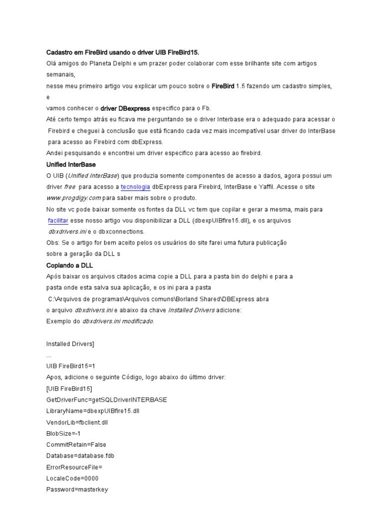 Obs: Se o artigo for bem aceito pelos os usurios do site farei uma futura publicao sobre a gerao da DLL s Copiando a DLL Aps baixar os arquivos citados acima copie a DLL para a pasta bin do delphi e para a pasta onde esta salva sua aplicao, e os ini para a pasta C:\Arquivos de programas\Arquivos comuns\Borland Shared\DBExpress abra o arquivo [Link] e abaixo da chave Installed Drivers adicione: Exemplo do [Link] modificado. Installed Drivers] ... UIB FireBird15=1 Apos, adicione o seguinte Cdigo, logo abaixo do ltimo driver: [UIB FireBird15] GetDriverFunc=getSQLDriverINTERBASE LibraryName=[Link] VendorLib=[Link] BlobSize=-1 CommitRetain=False Database=[Link] ErrorResourceFile= LocaleCode=0000 Password=masterkey