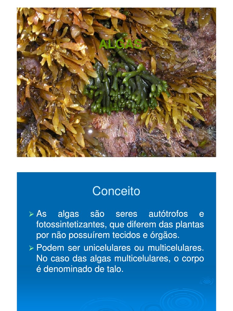 As algas so seres auttrofos e fotossintetizantes, que diferem das plantas por no possurem tecidos e rgos rgos. . Podem ser unicelulares ou multicelulares multicelulares. . No caso das algas multicelulares, o corpo denominado de talo talo. .