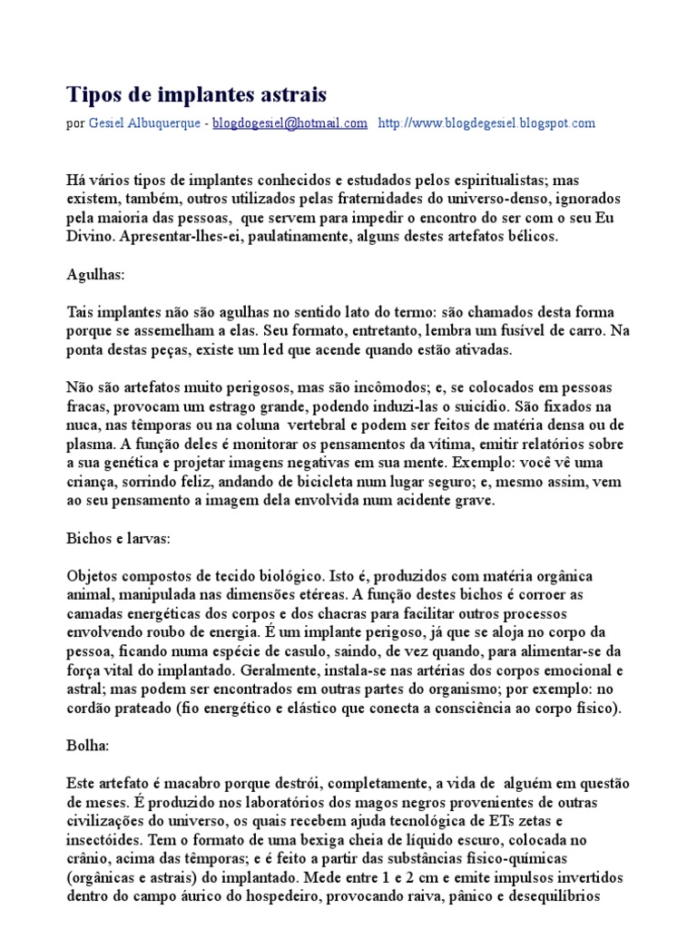 Há vários tipos de implantes conhecidos e estudados pelos espiritualistas; mas existem, também, outros utilizados pelas fraternidades do universo-denso, ignorados pela maioria das pessoas, que servem para impedir o encontro do ser com o seu Eu Divino. Apresentar-lhes-ei, paulatinamente, alguns destes artefatos bélicos. Agulhas: Tais implantes não são agulhas no sentido lato do termo: são chamados desta forma porque se assemelham a elas. Seu formato, entretanto, lembra um fusível de carro. Na ponta destas peças, existe um led que acende quando estão ativadas. Não são artefatos muito perigosos, mas são incômodos; e, se colocados em pessoas fracas, provocam um estrago grande, podendo induzi-las o suicídio. São fixados na nuca, nas têmporas ou na coluna vertebral e podem ser feitos de matéria densa ou de plasma. A função deles é monitorar os pensamentos da vítima, emitir relatórios sobre a sua genética e projetar imagens negativas em sua mente. Exemplo: você vê uma criança, sorrindo feliz, andando de bicicleta num lugar seguro; e, mesmo assim, vem ao seu pensamento a imagem dela envolvida num acidente grave. Bichos e larvas: Objetos compostos de tecido biológico. Isto é, produzidos com matéria orgânica animal, manipulada nas dimensões etéreas. A função destes bichos é corroer as camadas energéticas dos corpos e dos chacras para facilitar outros processos envolvendo roubo de energia. É um implante perigoso, já que se aloja no corpo da pessoa, ficando numa espécie de casulo, saindo, de vez quando, para alimentar-se da força vital do implantado. Geralmente, instala-se nas artérias dos corpos emocional e astral; mas podem ser encontrados em outras partes do organismo; por exemplo: no cordão prateado (fio energético e elástico que conecta a consciência ao corpo físico). Bolha: Este artefato é macabro porque destrói, completamente, a vida de alguém em questão de meses. É produzido nos laboratórios dos magos negros provenientes de outras civilizações do universo, os quais recebem ajuda tecnológica de ETs zetas e insectóides. Tem o formato de uma bexiga cheia de líquido escuro, colocada no crânio, acima das têmporas; e é feito a partir das substâncias físico-químicas (orgânicas e astrais) do implantado. Mede entre 1 e 2 cm e emite impulsos invertidos dentro do campo áurico do hospedeiro, provocando raiva, pânico e desequilíbrios