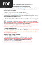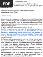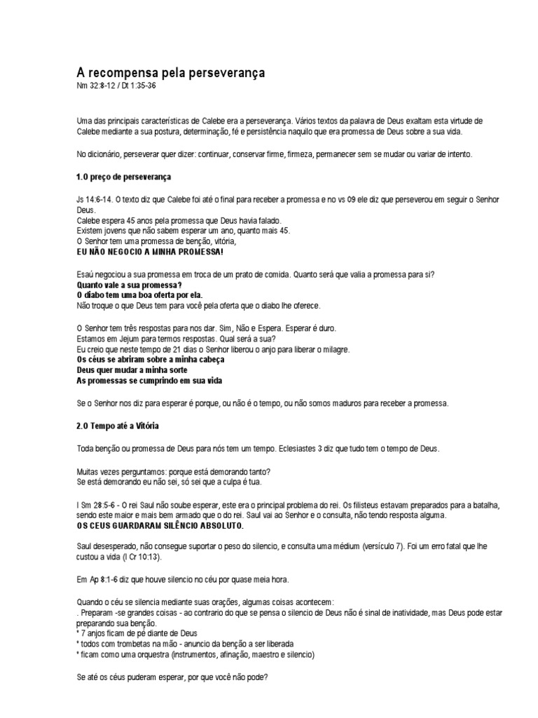 Nm 32:8-12 / Dt 1:35-36 Uma das principais caractersticas de Calebe era a perseverana. Vrios textos da palavra de Deus exaltam esta virtude de Calebe mediante a sua postura, determinao, f e persistncia naquilo que era promessa de Deus sobre a sua vida. No dicionrio, perseverar quer dizer: continuar, conservar firme, firmeza, permanecer sem se mudar ou variar de intento. 1.O preo de perseverana Js 14:6-14. O texto diz que Calebe foi at o final para receber a promessa e no vs 09 ele diz que perseverou em seguir o Senhor Deus. Calebe espera 45 anos pela promessa que Deus havia falado. Existem jovens que no sabem esperar um ano, quanto mais 45. O Senhor tem uma promessa de beno, vitria, EU NO NEGOCIO A MINHA PROMESSA! Esa negociou a sua promessa em troca de um prato de comida. Quanto ser que valia a promessa para si? Quanto vale a sua promessa? O diabo tem uma boa oferta por ela. No troque o que Deus tem para voc pela oferta que o diabo lhe oferece. O Senhor tem trs respostas para nos dar. Sim, No e Espera. Esperar duro. Estamos em Jejum para termos respostas. Qual ser a sua? Eu creio que neste tempo de 21 dias o Senhor liberou o anjo para liberar o milagre. Os cus se abriram sobre a minha cabea Deus quer mudar a minha sorte As promessas se cumprindo em sua vida Se o Senhor nos diz para esperar porque, ou no o tempo, ou no somos maduros para receber a promessa. 2.O Tempo at a Vitria Toda beno ou promessa de Deus para ns tem um tempo. Eclesiastes 3 diz que tudo tem o tempo de Deus. Muitas vezes perguntamos: porque est demorando tanto? Se est demorando eu no sei, s sei que a culpa tua. I Sm 28:5-6 - O rei Saul no soube esperar, este era o principal problema do rei. Os filisteus estavam preparados para a batalha, sendo este maior e mais bem armado que o do rei. Saul vai ao Senhor e o consulta, no tendo resposta alguma. OS CEUS GUARDARAM SILNCIO ABSOLUTO. Saul desesperado, no consegue suportar o peso do silencio, e consulta uma mdium (versculo 7). Foi um erro fatal que lhe custou a vida (I Cr 10:13). Em Ap 8:1-6 diz que houve silencio no cu por quase meia hora. Quando o cu se silencia mediante suas oraes, algumas coisas acontecem: . Preparam -se grandes coisas - ao contrario do que se pensa o silencio de Deus no sinal de inatividade, mas Deus pode estar preparando sua beno. * 7 anjos ficam de p diante de Deus * todos com trombetas na mo - anuncio da beno a ser liberada * ficam como uma orquestra (instrumentos, afinao, maestro e silencio) Se at os cus puderam esperar, por que voc no pode?