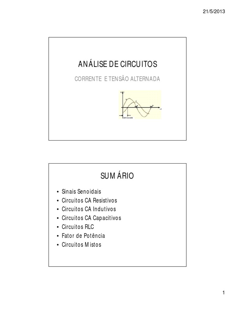 Sinais Senoidais Circuitos CA Resistivos Circuitos CA Indutivos Circuitos CA Capacitivos Circuitos RLC Fator de Potncia Circuitos Mistos