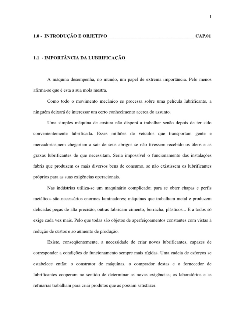 A mquina desempenha, no mundo, um papel de extrema importncia. Pelo menos afirma-se que esta a sua mola mestra. Como todo o movimento mecnico se processa sobre uma pelcula lubrificante, a ningum deixar de interessar um certo conhecimento acerca do assunto. Uma simples mquina de costura no dispor a trabalhar seno depois de ter sido convenientemente lubrificada. Esses milhes de veculos que transportam gente e mercadorias,nem chegariam a sair de seus abrigos se no tivessem recebido os leos e as graxas lubrificantes de que necessitam. Seria impossvel o funcionamento das instalaes fabris que produzem os mais diversos bens de consumo, se no existissem os lubrificantes prprios para as suas exigncias operacionais. Nas indstrias utiliza-se um maquinrio complicado; para se obter chapas e perfis metlicos so necessrios enormes laminadores; mquinas que trabalham metal e produzem delicadas peas de alta preciso; outras fabricam cimento, borracha, plsticos... E a todos s exige cada vez mais. Pelo que todas so objetos de aperfeioamentos constantes com vistas reduo de custos e ao aumento de produo. Existe, conseqentemente, a necessidade de criar novos lubrificantes, capazes de corresponder a condies de funcionamento sempre mais rgidas. Uma cadeia de esforos se estabelece ento: o construtor de mquinas, o comprador destas e o fornecedor de lubrificantes cooperam no sentido de determinar as novas exigncias; os laboratrios e as refinarias trabalham para criar produtos que as possam satisfazer.