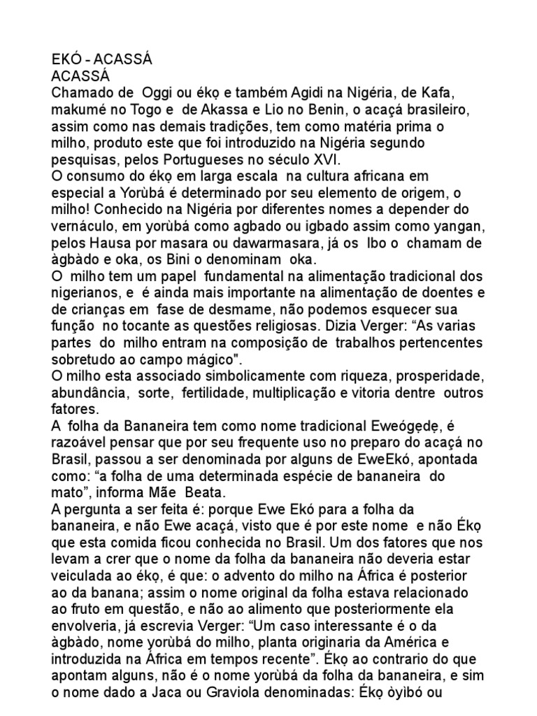 por Beata de Iemanja, que diz: Vrios axs no fazem uso da folha de bananeira para envolver o aca e afirma no considerar errado o fato de no enrolar o aca, o importante segundo ela : a sua presena como oferenda. O fato que, ao oferec-lo como alimento propiciatrio divindade, a folha deve ser retirada e de nada mais serve ao orix o qual foi ofertado, talvez, e s talvez, seja este fato que esteja levando alguns a abrir mo do uso da folha. Retirado se seu invlucro verde, ele constitui a comida dos orisa funfun afirma Juana Elbein. Isto faz crer que, como alimento ritual dedicado a outra divindade, que no seja funfun, por exemplo, ango, a folha no deva ser removida? Por mais uma vez somos obrigados a no concordar! Ela vai alm para determinar que: "Envolvido numa folha verde... simbolo de um ser e, como tal,...pode representar qualquer animal ou mesmo substituir um ser humano. Juana aponta a representao do aca como sendo a totalidade de um ser humano ou animal, nada reduzido a massa enceflica como informado por Me [Link] momento faz-se uma indagao: Dentro deste raciocnio, poderamos oferecer um acaa em substituio a um animal sacrificial, como por exemplo, a cabra? E no caso de obtermos um sim, (o que no concordo) em qual dos trs grupos de sangue este acaa-bra estaria relacionado, animal ou vegetal... no vermelho,preto ou o branco, relembrando que o invlucro do k, segundo ela, preto e seu contedo branco (ambos vegetais), no encontramos aqui o vermelho. O que a autora no mencionou o fato de que na tradio das divindades em questo o sacrifcio humano foi substitudo pelo sacrifcio da cabra, no de um aca, e este fato esta registrado nos contos sagrados de If. No esta sendo aqui questionado o poder mgico da folha ou do fruto da bananeira, quanto menos o aca/k, quanto alimento tradicional tanto dos Yorb quanto de suas divindades, e sim, a alegao feita por alguns de que, para se ter ax, o k tem que ter sido enrolado na folha da bananeira[...] ou que, s vira acak depois do contato com a folha da bananeira, e por fim que seja a folha da bananeira a nica ao qual o aca (k) deve e possa ser envolto.
