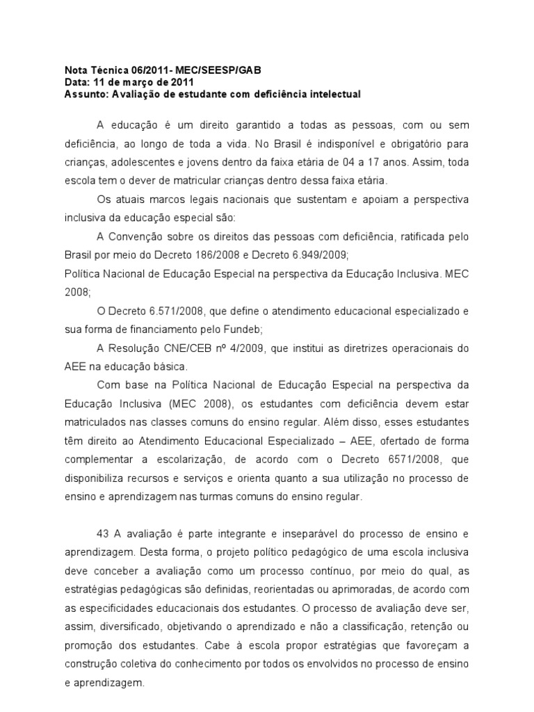 Nota Tcnica 06/2011- MEC/SEESP/GAB Data: 11 de maro de 2011 Assunto: Avaliao de estudante com deficincia intelectual