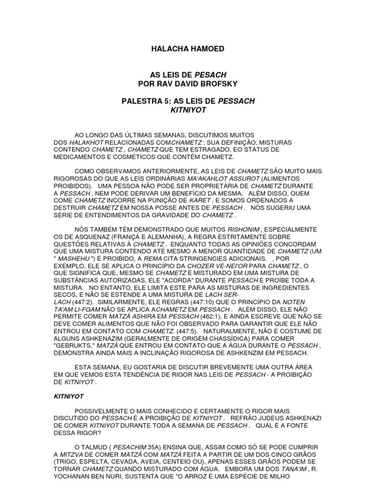 AS LEIS DE PESACH POR RAV DAVID BROFSKY PALESTRA 5: AS LEIS DE PESSACH KITNIYOT