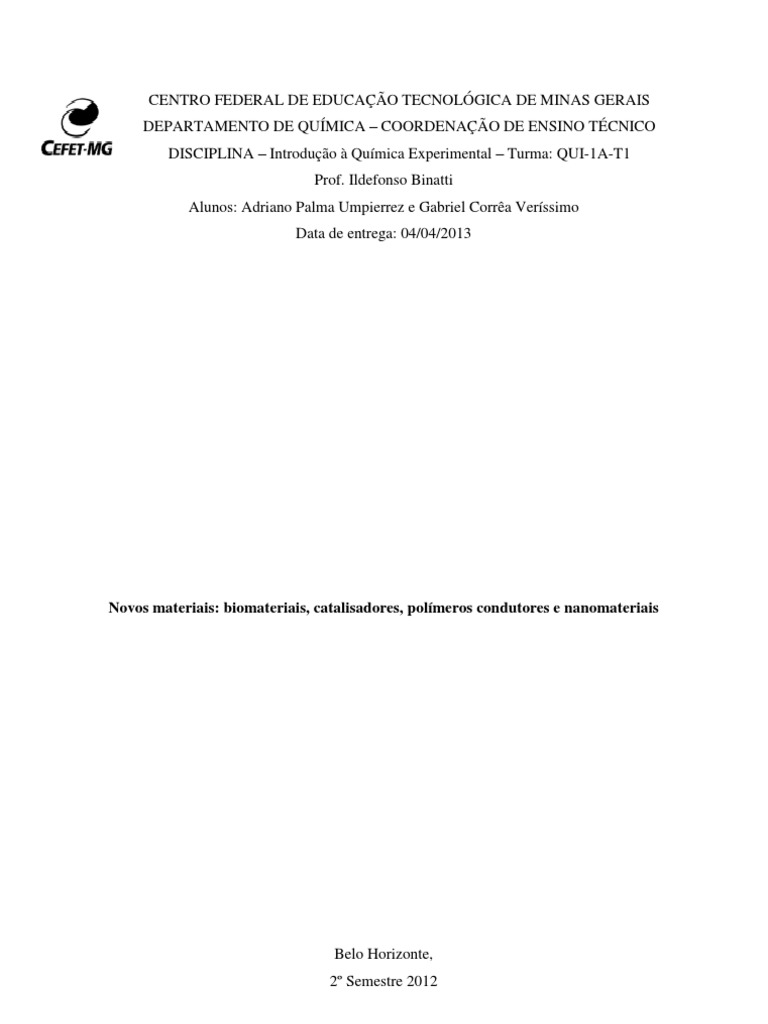 tecidos danificados ou doentes. As aplicaes destes materiais so muito amplas, sendo utilizando, por exemplo, em implantes dentrios ou de articulaes, como o joelho, placas e parafusos ortopdicos, at vlvulas cardacas, lentes de contato, aparelhos intrauterinos, fios de sutura, enchimentos para cirurgia plstica, entre outros. So materiais de baixa toxidade, que funcionam a partir dos estudos de biocompatibilidades em seres vivos, j que estes devem ter um comportamento mecnico adequado funo que desempenha, sem prejudicar o seu hospedeiro. Os catalisadores funcionam atravs da diminuio da energia de ativao, fornecendo assim um caminho alternativo que evita o passo lento, aumentando a velocidade de uma reao sem participar ou se consumir durante a reao. Os catalizadores esto presentes em inmeras situaes, desde processos bioqumicos naturais e processos industriais, at s reaes que ocorrem na atmosfera, como por exemplo, a destruio do oznio (O3) na estratosfera. Os plsticos e os polmeros orgnicos, derivado de petrleo, so isolantes eltricos. Entretanto, os polmeros condutores so diferentes, este material apresenta sequncias de tomos de carbono ligados a tomos de hidrognio, possibilitando a conduo de eletricidade. Tal tipo de material tem aplicaes tecnolgicas muito extensas como, por exemplo, em cabos coaxiais, em baterias recarregveis, na forma de lminas (filmes) finas e em telas de televisores e de monitores de computador. Os nanomateriais podem ser usados: na indstria de cosmticos para a fabricao dos protetores solares, utilizando nanopartculas de TiO2 (14 nm) e ZnO (30-200 nm) que tem a propriedade de absorver a radiao ultravioleta (UV) nociva a pele humana; nas diversas reas da indstria mecnica atravs do nanotubos de carbono que tm alta resistncia mecnica, alta capilaridade e estrutura eletrnica nica; na descontaminao ambiental atravs do fotocatalisador TiO2 que tem capacidade de fotodegradao de componentes orgnicos; na nanomedicina, na qual se destacam os pontos qunticos de sulfeto de cdmio luminescentes, tem sido alvo de estudos que se demonstram capazes de identificar antgenos em clulas vermelhas do sangue (biomarcadores).