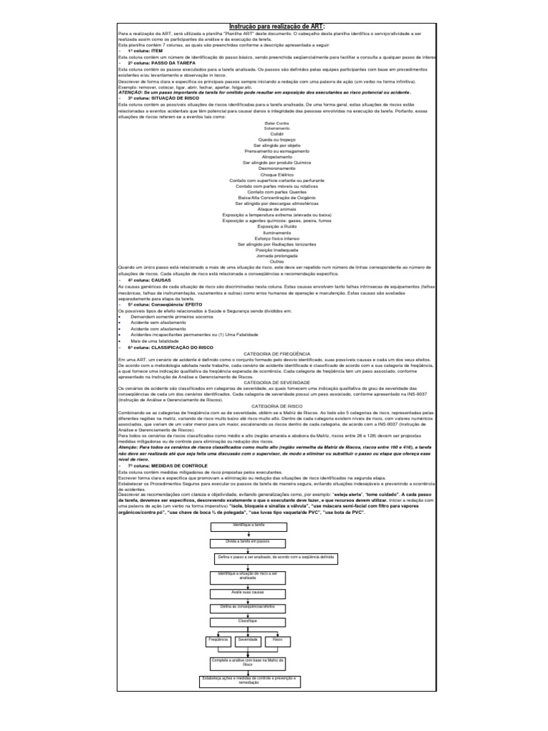 Colidir Queda ou tropeo Ser atingido por objeto Prensamento ou esmagamento Atropelamento Ser atingido por produto Qumico Desmoronamento Choque Eltrico Contato com superfcie cortante ou perfurante Contato com partes mveis ou rotativas Contato com partes Quentes Baixa/Alta Concentrao de Oxignio Ser atingido por descargas atmosfricas Ataque de animais Exposio a temperatura extrema (elevada ou baixa) Exposio a agentes qumicos: gases, poeira, fumos Exposio a Rudo Iluminamento Esforo fsico intenso Ser atingido por Radiaes Ionizantes Posio Inadequada Jornada prolongada Outros Quando um nico passo est relacionado a mais de uma situao de risco, este deve ser repetido num nmero de linhas correspondente ao nmero de situaes de riscos. Cada situao de risco est relacionada a conseqncias e recomendao especifica. 4 coluna: CAUSAS As causas genricas de cada situao de risco so discriminadas nesta coluna. Estas causas envolvem tanto falhas intrnsecas de equipamentos (falhas mecnicas, falhas de instrumentao, vazamentos e outras) como erros humanos de operao e manuteno. Estas causas so avaliadas separadamente para etapa da tarefa. 5 coluna: Conseqncia/ EFEITO Os possveis tipos de efeito relacionados Sade e Segurana sendo divididos em: Demandam somente primeiros socorros Acidente sem afastamento Acidente com afastamento Acidentes incapacitantes permanentes ou (1) Uma Fatalidade Mais de uma fatalidade 6 coluna: CLASSIFICAO DO RISCO CATEGORIA DE FREQNCIA Em uma ART, um cenrio de acidente definido como o conjunto formado pelo desvio identificado, suas possveis causas e cada um dos seus efeitos. De acordo com a metodologia adotada neste trabalho, cada cenrio de acidente identificado classificado de acordo com a sua categoria de freqncia, a qual fornece uma indicao qualitativa da freqncia esperada de ocorrncia. Cada categoria de freqncia tem um peso associado, conforme apresentado na Instruo de Anlise e Gerenciamento de Riscos. CATEGORIA DE SEVERIDADE Os cenrios de acidente so classificados em categorias de severidade, as quais fornecem uma indicao qualitativa do grau de severidade das conseqncias de cada um dos cenrios identificados. Cada categoria de severidade possui um peso associado, conforme apresentado na INS-0037 (Instruo de Anlise e Gerenciamento de Riscos). CATEGORIA DE RISCO Combinando-se as categorias de freqncia com as de severidade, obtm-se a Matriz de Riscos. Ao todo so 5 categorias de risco, representadas pelas diferentes regies na matriz, variando de risco muito baixo at risco muito alto. Dentro de cada categoria existem nveis de risco, com valores numricos associados, que variam de um valor menor para um maior, escalonando os riscos dentro de cada categoria, de acordo com a INS-0037 (Instruo de Anlise e Gerenciamento de Riscos). Para todos os cenrios de riscos classificados como mdio e alto (regio amarela e abobora da Matriz, riscos entre 26 e 128) devem ser propostas medidas mitigadoras ou de controle para eliminao ou reduo dos riscos. Ateno: Para todos os cenrios de riscos classificados como muito alto (regio vermelha da Matriz de Riscos, riscos entre 160 e 416), a tarefa no deve ser realizada at que seja feita uma discusso com o supervisor, de modo a eliminar ou substituir o passo ou etapa que oferea esse nvel de risco. 7 coluna: MEDIDAS DE CONTROLE Esta coluna contm medidas mitigadoras de risco propostas pelos executantes. Escrever forma clara e especifica que promovam a eliminao ou reduo das situaes de risco identificados na segunda etapa. Estabelecer os Procedimentos Seguros para executar os passos da tarefa de maneira segura, evitando situaes indesejveis e prevenindo a ocorrncia de acidentes. Descrever as recomendaes com clareza e objetividade, evitando generalizaes como, por exemplo: esteja alerta, tome cuidado. A cada passo da tarefa, devemos ser especficos, descrevendo exatamente o que o executante deve fazer, e que recursos devem utilizar. Iniciar a redao com uma palavra de ao (um verbo na forma imperativa) isole, bloqueie e sinalize a vlvula, use mscara semi-facial com filtro para vapores orgnicos/contra p, use chave de boca de polegada, use luvas tipo vaqueta/de PVC, use bota de PVC.
