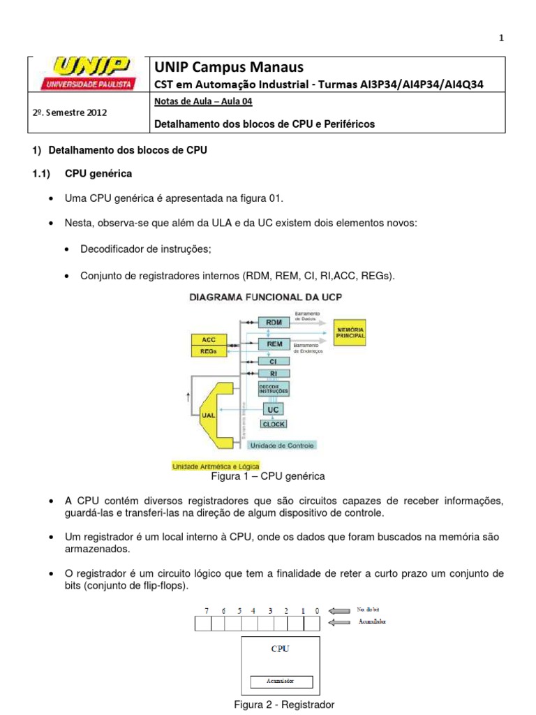 Figura 1 CPU genrica A CPU contm diversos registradores que so circuitos capazes de receber informaes, guard-las e transferi-las na direo de algum dispositivo de controle. Um registrador um local interno CPU, onde os dados que foram buscados na memria so armazenados. O registrador um circuito lgico que tem a finalidade de reter a curto prazo um conjunto de bits (conjunto de flip-flops).