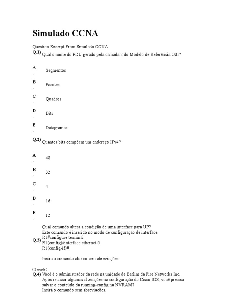Question Excerpt From Simulado CCNA Q.1) Qual o nome do PDU gerado pela camada 2 do Modelo de Referncia OSI? A . B . C . D . E . Q.2) A . B . C . D . E . Segmentos Pacotes Quadros Bits Datagramas Quantos bits compem um endereo IPv4? 48 32 4 16 12