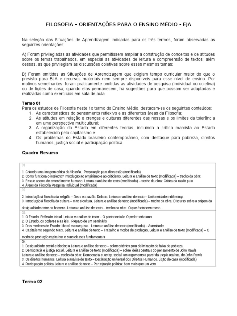 Na seleo das Situaes de Aprendizagem indicadas para os trs termos, foram observadas as seguintes orientaes: A) Foram privilegiadas as atividades que permitissem ampliar a construo de conceitos e de atitudes sobre os temas trabalhados, em especial as atividades de leitura e compreenso de textos; alm dessas, as que privilegiam as discusses coletivas sobre esses mesmos temas; B) Foram omitidas as Situaes de Aprendizagem que exigiam tempo curricular maior do que o previsto para EJA e recursos materiais nem sempre disponveis para esse nvel de ensino. Por motivos semelhantes, foram praticamente omitidas as atividades de pesquisa (individual ou coletiva) ou de lies de casa; quando elas permanecem, h sugestes para que possam ser adaptadas e realizadas como exerccios em sala de aula. Termo 01 Para os estudos de Filosofia neste 1o termo do Ensino Mdio, destacam-se os seguintes contedos: 1. As caractersticas do pensamento reflexivo e as diferentes reas da Filosofia; 2. As atitudes em relao a crenas e culturas diferentes das nossas e os limites da tolerncia em uma perspectiva multicultural; 3. A organizao do Estado em diferentes teorias, incluindo a crtica marxista ao Estado estabelecido pelo capitalismo e 4. Os problemas do Estado brasileiro contemporneo, com destaque para pobreza, direitos humanos, justia social e participao poltica. Situao de Aprendizagem Atividades