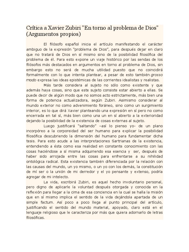 El filósofo español inicia el artículo manifestando el carácter ambiguo de la expresión “problema de Dios”, para después dejar en claro que no tratará de Dios en sí mismo sino de la posibilidad filosófica del problema de él. Para esto expone un viaje histórico por las sendas de los filósofos más destacados en argumentos en torno al problema de Dios, sin embargo esto no será de mucha utilidad puesto que no coincidirá formalmente con lo que intenta plantear, a pesar de esto también grosso modo expresa las ideas epistémicas de las corrientes idealistas y realistas. Más tarde considera al sujeto no sólo como existente y que además haya cosas, sino que este sujeto consiste estar abierto a ellas. Se puede decir de algún modo que no somos acto estrictamente, más bien una forma de potencia actualizadora, según Zubiri. Asimismo considerar al mundo exterior no como advenimiento foráneo, sino como un surgimiento interior, es lo que dirá Xavier planteando una expresión en sí pero no como encerrada en tal sí, más bien como una un en sí abierto a la exterioridad dejando la posibilidad de la existencia de cosas externas al sujeto. Luego justificará “saltando” –así lo pienso yo- de un plano incorpóreo a la corporeidad del ser humano para explicar la posibilidad filosófica descubriendo la dimensión del humano para fundamentar dicha tesis. Para esto acude a las interpretaciones Sartrianas de la existencia, entendiendo a ésta como esa realidad en constante conocimiento con las cosas haciéndose a sí misma adquiriendo esa esencia y ser, después de haber sido arrojada entre las cosas para enfrentarse a su nihilidad ontológica radical. Esta existencia también diferenciada por la relación con las causas del mundo, un yo mismo, o un yo con los demás, la constitución de mí ser o la unión de mi derredor y el yo pensante y extenso, podría agregar de mi intelecto. La vida, escribirá Zubiri, es aquel hecho involuntario personal, pero digno de aplicarle la voluntad después otorgada y conocida en la reflexión para llegar a la cima de esa conciencia en la cual se halla la misión que en sí mismo implica el sentido de la vida dejándola apartada de un simple factum. Así poco a poco llega al punto principal del artículo, justificando el sentido del mundo material, apoyado, claro está en el lenguaje religioso que le caracteriza por más que quiera adornarlo de letras filosóficas.