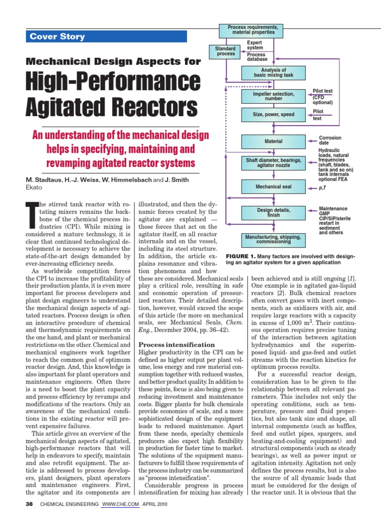 he stirred tank reactor with rotating mixers remains the backbone of the chemical process industries (CPI). While mixing is considered a mature technology, it is clear that continued technological development is necessary to achieve the state-of-the-art design demanded by ever-increasing efficiency needs. As worldwide competition forces the CPI to increase the profitability of their production plants, it is even more important for process developers and plant design engineers to understand the mechanical design aspects of agitated reactors. Process design is often an interactive procedure of chemical and thermodynamic requirements on the one hand, and plant or mechanical restrictions on the other. Chemical and mechanical engineers work together to reach the common goal of optimum reactor design. And, this knowledge is also important for plant operators and maintenance engineers. Often there is a need to boost the plant capacity and process efficiency by revamps and modifications of the reactors. Only an awareness of the mechanical conditions in the existing reactor will prevent expensive failures. This article gives an overview of the mechanical design aspects of agitated, high-performance reactors that will help in endeavors to specify, maintain and also retrofit equipment. The article is addressed to process developers, plant designers, plant operators and maintenance engineers. First, the agitator and its components are