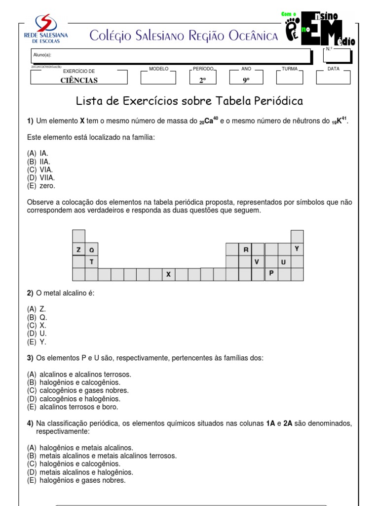 2) O metal alcalino : (A) (B) (C) (D) (E) Z. Q. X. U. Y.