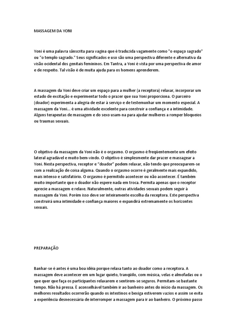 A massagem da Yoni deve criar um espao para a mulher (a receptora) relaxar, incorporar um estado de excitao e experimentar todo o prazer que sua Yoni proporciona. O parceiro (doador) experimenta a alegria de estar servio e de testemunhar um momento especial. A massagem da Yoni... uma atividade excelente para construir a confiana e a intimidade. Alguns terapeutas de massagem e do sexo usam-na para ajudar mulheres a romper bloqueios ou traumas sexuais.