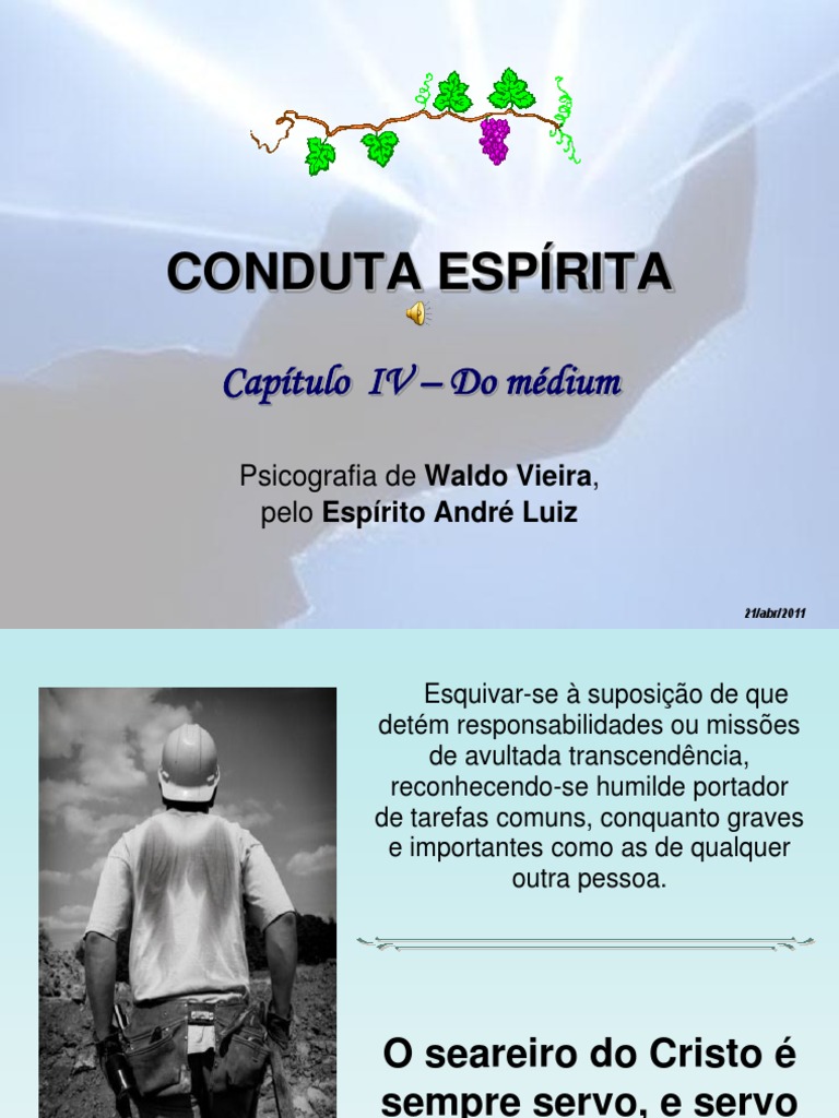 conquanto graves e importantes como as de qualquer outra pessoa. O seareiro do Cristo é sempre servo. Livro Conduta Espírita Capítulo IV – Do médium 21/abr/2011 – slide 2 de 11 . reconhecendo-se humilde portador de tarefas comuns.Esquivar-se à suposição de que detém responsabilidades ou missões de avultada transcendência. e servo do amor.