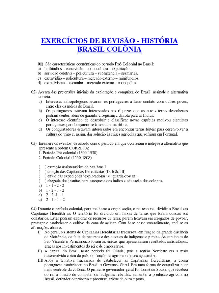 01) So caractersticas econmicas do perodo Pr-Colonial no Brasil: a) latifndios escravido monocultura exportao. b) servido coletiva policultura subsistncia sesmarias. c) escravido policultura mercado externo minifndios. d) extrativismo escambo mercado externo monoplio. 02) Acerca das pretenses iniciais da explorao e conquista do Brasil, assinale a alternativa correta. a) Interesses antropolgicos levaram os portugueses a fazer contato com outros povos, entre eles os ndios do Brasil. b) Os portugueses estavam interessados nas riquezas que as novas terras descobertas podiam conter, alm de garantir a segurana da rota para as Indias. c) O interesse cientfico de descobrir e classificar novas espcies motivou cientistas portugueses para lanarem-se aventura martima. d) Os conquistadores estavam interessados em encontrar terras frteis para desenvolver a cultura do trigo e, assim, dar soluo s crises agrcolas que sofriam em Portugal. 03) Enumere os eventos, de acordo com o perodo em que ocorreram e indique a alternativa que apresente a ordem CORRETA: 1. Perodo Pr-colonial (1500-1530) 2. Perodo Colonial (1530-1808) ( ( ( ( a) b) c) d) ) extrao assistemtica de pau-brasil. ) criao das Capitanias Hereditrias (D. Joo III). ) envio das expedies "exploradoras" e "guarda-costas". ) chegada dos jesutas para catequese dos ndios e educao dos colonos. 1-1-2-2 1-2-1-2 2 - 2 -1 - 1 2-1-12