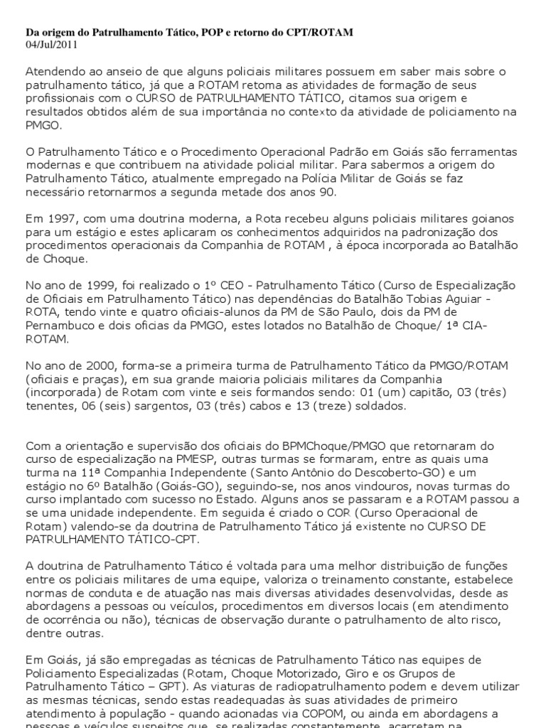 mais sobre o patrulhamento ttico, j que a ROTAM retoma as atividades de formao de seus profissionais com o CURSO de PATRULHAMENTO TTICO, citamos sua origem e resultados obtidos alm de sua importncia no contexto da atividade de policiamento na PMGO. O Patrulhamento Ttico e o Procedimento Operacional Padro em Gois so ferramentas modernas e que contribuem na atividade policial militar. Para sabermos a origem do Patrulhamento Ttico, atualmente empregado na Polcia Militar de Gois se faz necessrio retornarmos a segunda metade dos anos 90. Em 1997, com uma doutrina moderna, a Rota recebeu alguns policiais militares goianos para um estgio e estes aplicaram os conhecimentos adquiridos na padronizao dos procedimentos operacionais da Companhia de ROTAM , poca incorporada ao Batalho de Choque. No ano de 1999, foi realizado o 1 CEO - Patrulhamento Ttico (Curso de Especializao de Oficiais em Patrulhamento Ttico) nas dependncias do Batalho Tobias Aguiar ROTA, tendo vinte e quatro oficiais-alunos da PM de So Paulo, dois da PM de Pernambuco e dois oficias da PMGO, estes lotados no Batalho de Choque/ 1 CIAROTAM. No ano de 2000, forma-se a primeira turma de Patrulhamento Ttico da PMGO/ROTAM (oficiais e praas), em sua grande maioria policiais militares da Companhia (incorporada) de Rotam com vinte e seis formandos sendo: 01 (um) capito, 03 (trs) tenentes, 06 (seis) sargentos, 03 (trs) cabos e 13 (treze) soldados. Com a orientao e superviso dos oficiais do BPMChoque/PMGO que retornaram do curso de especializao na PMESP, outras turmas se formaram, entre as quais uma turma na 11 Companhia Independente (Santo Antnio do Descoberto-GO) e um estgio no 6 Batalho (Gois-GO), seguindo-se, nos anos vindouros, novas turmas do curso implantado com sucesso no Estado. Alguns anos se passaram e a ROTAM passou a se uma unidade independente. Em seguida criado o COR (Curso Operacional de Rotam) valendo-se da doutrina de Patrulhamento Ttico j existente no CURSO DE PATRULHAMENTO TTICO-CPT. A doutrina de Patrulhamento Ttico voltada para uma melhor distribuio de funes entre os policiais militares de uma equipe, valoriza o treinamento constante, estabelece normas de conduta e de atuao nas mais diversas atividades desenvolvidas, desde as abordagens a pessoas ou veculos, procedimentos em diversos locais (em atendimento de ocorrncia ou no), tcnicas de observao durante o patrulhamento de alto risco, dentre outras. Em Gois, j so empregadas as tcnicas de Patrulhamento Ttico nas equipes de Policiamento Especializadas (Rotam, Choque Motorizado, Giro e os Grupos de Patrulhamento Ttico GPT). As viaturas de radiopatrulhamento podem e devem utilizar as mesmas tcnicas, sendo estas readequadas s suas atividades de primeiro atendimento populao - quando acionadas via COPOM, ou ainda em abordagens a pessoas e veculos suspeitos que, se realizadas constantemente, acarretam na