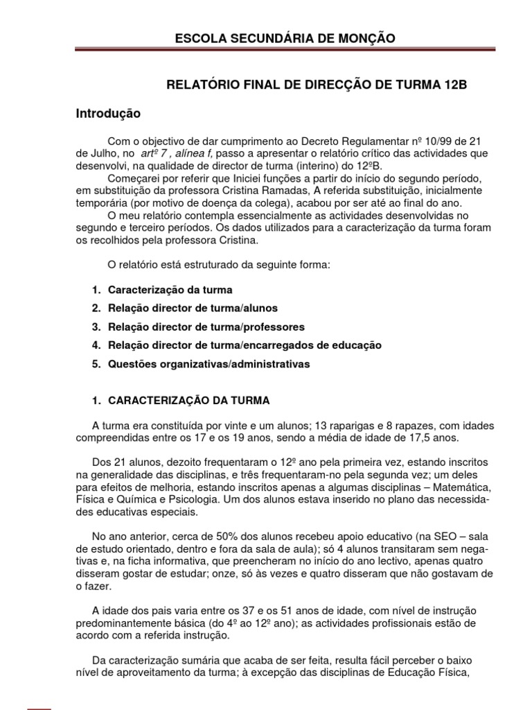 Com o objectivo de dar cumprimento ao Decreto Regulamentar n 10/99 de 21 de Julho, no art 7 , alnea f, passo a apresentar o relatrio crtico das actividades que desenvolvi, na qualidade de director de turma (interino) do 12B. Comearei por referir que Iniciei funes a partir do incio do segundo perodo, em substituio da professora Cristina Ramadas, A referida substituio, inicialmente temporria (por motivo de doena da colega), acabou por ser at ao final do ano. O meu relatrio contempla essencialmente as actividades desenvolvidas no segundo e terceiro perodos. Os dados utilizados para a caracterizao da turma foram os recolhidos pela professora Cristina. O relatrio est estruturado da seguinte forma: 1. Caracterizao da turma 2. Relao director de turma/alunos 3. Relao director de turma/professores 4. Relao director de turma/encarregados de educao 5. Questes organizativas/administrativas