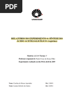 A prtica realizada permitiu ao grupo sintetizar um dos compostos orgnicos mais populares e rentveis conhecidos, o cido acetil saliclico. Sua importncia como medicamento histrica e at hoje sua sntese realizada em laboratrios por todo o mundo. O experimento realizado foi bem sucedido, com um rendimento consideravelmente alto (maior de 70%). Dessa forma, as etapas de sntese, com posterior purificao e recristalizao do composto tiveram sua eficcia comprovada, tanto visualmente como em termos de rendimento. Entretanto, a etapa de teste de presena de fenol falhou, com a verificao de uma cor violeta no composto, aps a adio do cloreto de ferro. Isso indicou que o composto sintetizado estava com um excesso de fenol em sua composio.