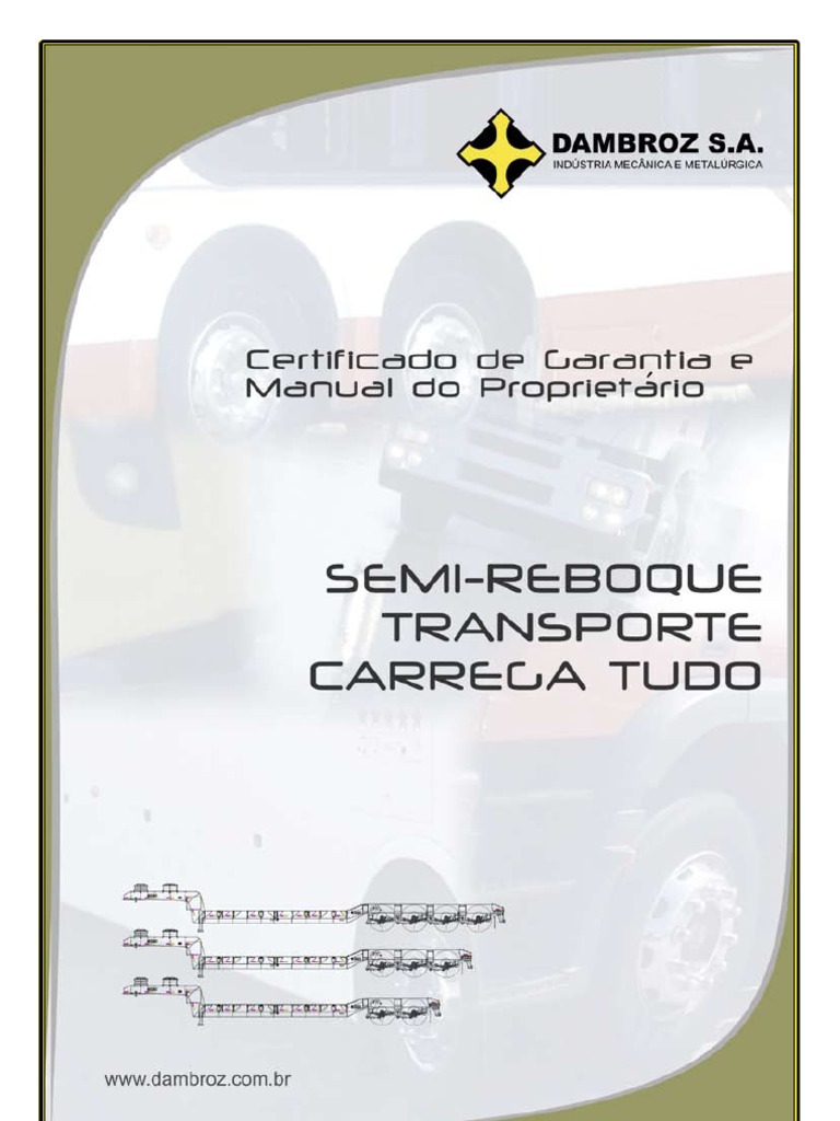 03 - CERTIFICADO DE GARANTIA A DAMBROZ S.A. confere o implemento especificado neste manual uma garantia de doze (12) meses, contados da data de entrega tcnica ao Cliente, sem limites de quilometragem, contra defeitos de fbrica. A garantia cobre apenas as partes, peas e componentes fabricados pela DAMBROZ. Para os componentes adquiridos de terceiros, a DAMBROZ transfere a seus Clientes a garantia oferecida por seus fornecedores. A Dambroz Implementos Rodovirios observa que a garantia ser automaticamente encerrada caso seja constatada a no observncia da utilizao, conservao e funcionamento conforme Plano de Manuteno estabelecido neste manual. A garantia no se estende a defeitos oriundos de: - Transformao ou alterao do semi-reboque sem a autorizao da Dambroz S.A. - Utilizao do semi-reboque submetido a uma carga superior quela prevista, que est especificada na placa de registro (fixada no semi-reboque) e registrado na ordem de compra junto aos registros na Dambroz; - Defeitos provocados por acidentes, uso inadequado, servios de reconstruo, modificao e manuteno efetuados no semi-reboque por terceiros no autorizados pela Dambroz; - Defeitos causados por alteraes ou adaptaes de terceiros / rede autorizada em componentes fornecidos pela Dambroz, sem a nossa prvia autorizao, mesmo realizado em um representante autorizado da Dambroz; - Desgaste normal do semi-reboque e / ou de seus componentes, bem como daqueles que exijam substituies em manuteno normal e peridica fora dos Termos de Garantia como: Lonas de freios, rolamentos, tambores de freios, pneus, componentes eltricos, leos e graxas, alinhamento de eixos, lubrificao, re-apertos peridicos, limpeza do equipamento, arqueamento de eixos e feixes de molas; - Defeitos provocados por insuficincia na lubrificao ou falta de manuteno; - Deslocamento de pessoal, despesas com reboques e guinchos, decorrentes de acidentes e mau uso do implemento; - Defeitos decorrentes do uso inadequado do semi-reboque em operaes de transporte diferentes daquelas para as quais foi projetado. NOTAS: - Uma pea genuna substituda em regime de garantia na rede autorizada, tem o prazo de garantia vlido at o trmino da garantia do semi-reboque; - Uma pea genuna adquirida da rede autorizada, tem garantia contra defeitos de fabricao durante 06 meses, a partir da data da compra, mediante apresentao da nota fiscal; - A Dambroz Implementos Rodovirios reserva-se o direito de modificar as caractersticas e introduzir aprimoramentos em seus semi-reboques, sem incorrer na obrigao de efetuar a mesma alterao nos semi-reboque anteriores produzidos; - A presente garantia integra o contrato de compra do semi-reboque, obrigando as partes contratantes ao limite de suas condies e termos. IMPORTANTE: - Durante o processo de Garantia, alguns componentes como: tambores de freio, rodas, aros e viga dos eixos etc, necessitam de ensaios destrutivos para sua anlise, neste caso as peas no podero ser reutilizadas.