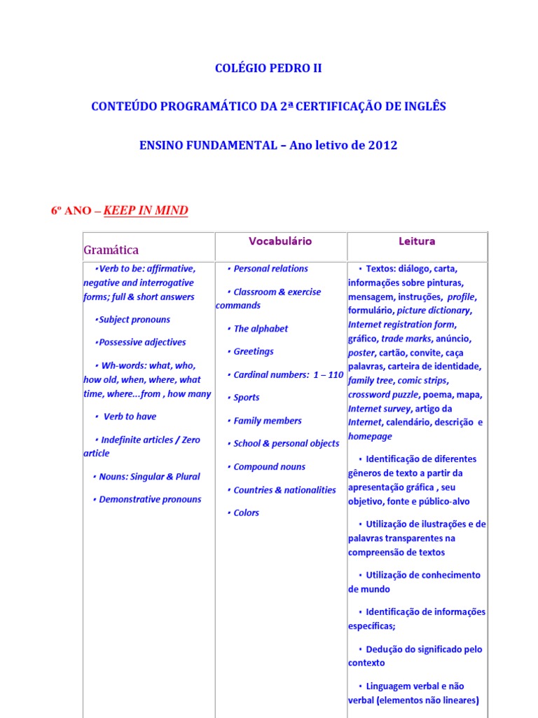 COLGIO PEDRO II CONTEDO PROGRAMTICO DA 2 CERTIFICAO DE INGLS ENSINO FUNDAMENTAL Ano letivo de 2012