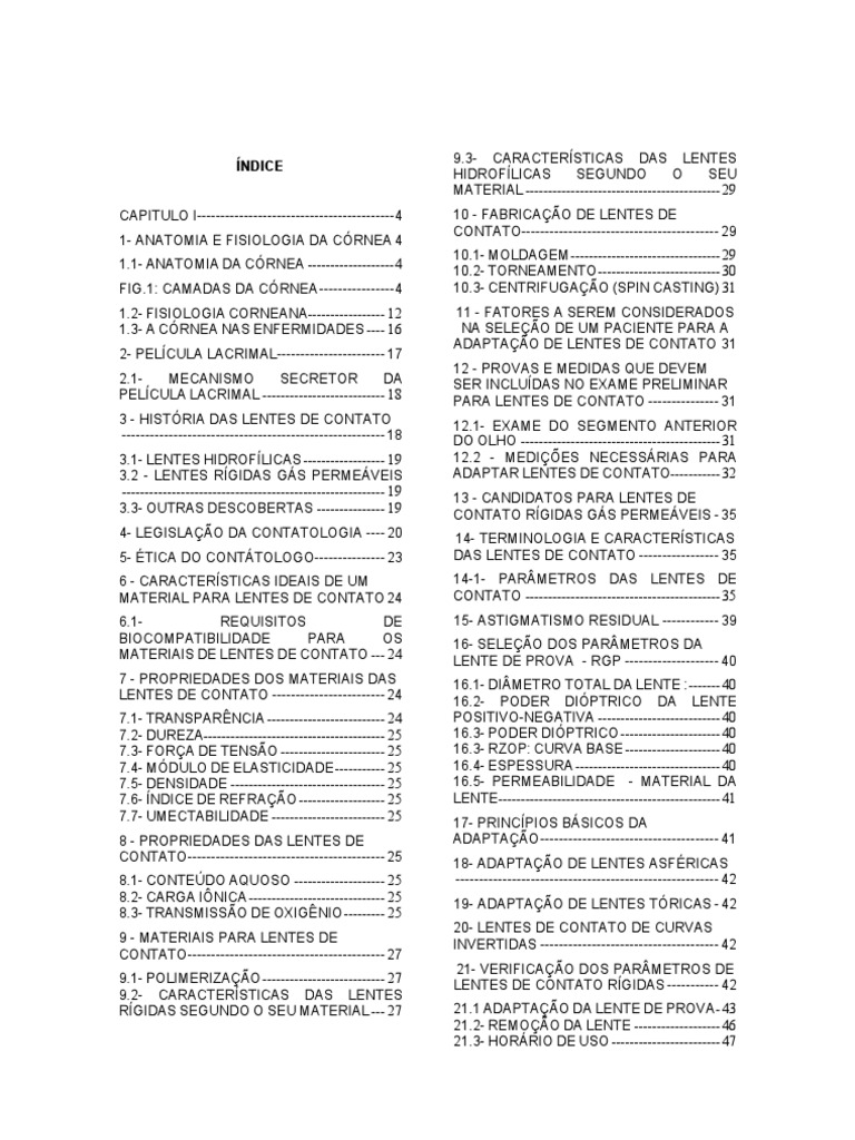 9.3- CARACTERSTICAS DAS LENTES HIDROFLICAS SEGUNDO O SEU MATERIAL ------------------------------------------- 29 10 - FABRICAO DE LENTES DE CONTATO------------------------------------------ 29 10.1- MOLDAGEM --------------------------------- 29 10.2- TORNEAMENTO --------------------------- 30 10.3- CENTRIFUGAO (SPIN CASTING) 31 11 - FATORES A SEREM CONSIDERADOS NA SELEO DE UM PACIENTE PARA A ADAPTAO DE LENTES DE CONTATO 31 12 - PROVAS E MEDIDAS QUE DEVEM SER INCLUDAS NO EXAME PRELIMINAR PARA LENTES DE CONTATO --------------- 31 12.1- EXAME DO SEGMENTO ANTERIOR DO OLHO -------------------------------------------- 31 12.2 - MEDIES NECESSRIAS PARA ADAPTAR LENTES DE CONTATO----------- 32 13 - CANDIDATOS PARA LENTES DE CONTATO RGIDAS GS PERMEVEIS - 35 14- TERMINOLOGIA E CARACTERSTICAS DAS LENTES DE CONTATO ----------------- 35 14-1- PARMETROS DAS LENTES DE CONTATO ------------------------------------------- 35 15- ASTIGMATISMO RESIDUAL ------------ 39 16- SELEO DOS PARMETROS DA LENTE DE PROVA - RGP -------------------- 40 16.1- DIMETRO TOTAL DA LENTE : ------- 40 16.2- PODER DIPTRICO DA LENTE POSITIVO-NEGATIVA --------------------------- 40 16.3- PODER DIPTRICO ---------------------- 40 16.3- RZOP: CURVA BASE --------------------- 40 16.4- ESPESSURA -------------------------------- 40 16.5- PERMEABILIDADE - MATERIAL DA LENTE------------------------------------------------- 41 17- PRINCPIOS BSICOS DA ADAPTAO-------------------------------------- 41 18- ADAPTAO DE LENTES ASFRICAS -------------------------------------------------------- 42 19- ADAPTAO DE LENTES TRICAS - 42 20- LENTES DE CONTATO DE CURVAS INVERTIDAS -------------------------------------- 42 21- VERIFICAO DOS PARMETROS DE LENTES DE CONTATO RGIDAS ----------- 42 21.1 ADAPTAO DA LENTE DE PROVA - 43 21.2- REMOO DA LENTE ------------------- 46 21.3- HORRIO DE USO ------------------------ 47