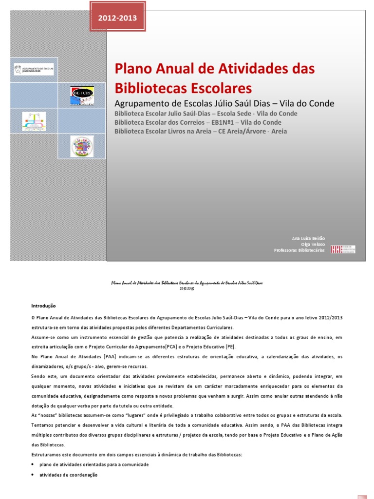 Introduo O Plano Anual de Atividades das Bibliotecas Escolares do Agrupamento de Escolas Julio Sal-Dias Vila do Conde para o ano letivo 2012/2013 estrutura-se em torno das atividades propostas pelos diferentes Departamentos Curriculares. Assume-se como um instrumento essencial de gesto que potencia a realizao de atividades destinadas a todos os graus de ensino, em estreita articulao com o Projeto Curricular do Agrupamento[PCA] e o Projeto Educativo [PE]. No Plano Anual de Atividades [PAA] indicam-se as diferentes estruturas de orientao educativa, a calendarizao das atividades, os dinamizadores, o/s grupo/s - alvo, gerem-se recursos. Sendo este, um documento orientador das atividades previamente estabelecidas, permanece aberto e dinmico, podendo integrar, em qualquer momento, novas atividades e iniciativas que se revistam de um carcter marcadamente enriquecedor para os elementos da comunidade educativa, designadamente como resposta a novos problemas que venham a surgir. Assim como anular outras atendendo no dotao de qualquer verba por parte da tutela ou outra entidade. As nossas bibliotecas assumem-se como lugares onde privilegiado o trabalho colaborativo entre todos os grupos e estruturas da escola. Tentamos potenciar e desenvolver a vida cultural e literria de toda a comunidade educativa. Assim sendo, o PAA das Bibliotecas integra mltiplos contributos dos diversos grupos disciplinares e estruturas / projetos da escola, tendo por base o Projeto Educativo e o Plano de Ao das Bibliotecas. Estruturamos este documento em dois campos essenciais dinmica de trabalho das Bibliotecas: plano de atividades orientadas para a comunidade atividades de coordenao