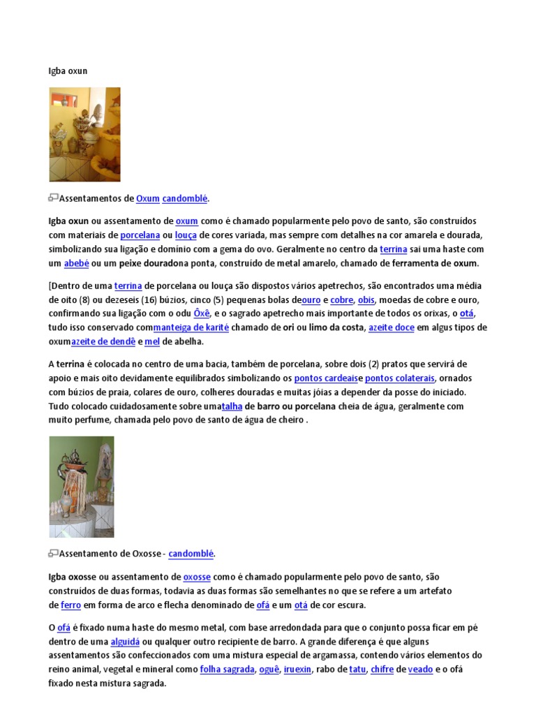 Assentamentos de Oxum candombl. Igba oxun ou assentamento de oxum como chamado popularmente pelo povo de santo, so construdos com materiais de porcelana ou loua de cores variada, mas sempre com detalhes na cor amarela e dourada, simbolizando sua ligao e domnio com a gema do ovo. Geralmente no centro da terrina sai uma haste com um abeb ou um peixe douradona ponta, construdo de metal amarelo, chamado de ferramenta de oxum. [Dentro de uma terrina de porcelana ou loua so dispostos vrios apetrechos, so encontrados uma mdia de oito (8) ou dezeseis (16) bzios, cinco (5) pequenas bolas deouro e cobre, obis, moedas de cobre e ouro, confirmando sua ligao com o odu x, e o sagrado apetrecho mais importante de todos os orixas, o ot, tudo isso conservado commanteiga de karit chamado de ori ou limo da costa, azeite doce em algus tipos de oxumazeite de dend e mel de abelha. A terrina colocada no centro de uma bacia, tambm de porcelana, sobre dois (2) pratos que servir de apoio e mais oito devidamente equilibrados simbolizando os pontos cardeaise pontos colaterais, ornados com bzios de praia, colares de ouro, colheres douradas e muitas jias a depender da posse do iniciado. Tudo colocado cuidadosamente sobre umatalha de barro ou porcelana cheia de gua, geralmente com muito perfume, chamada pelo povo de santo de gua de cheiro .