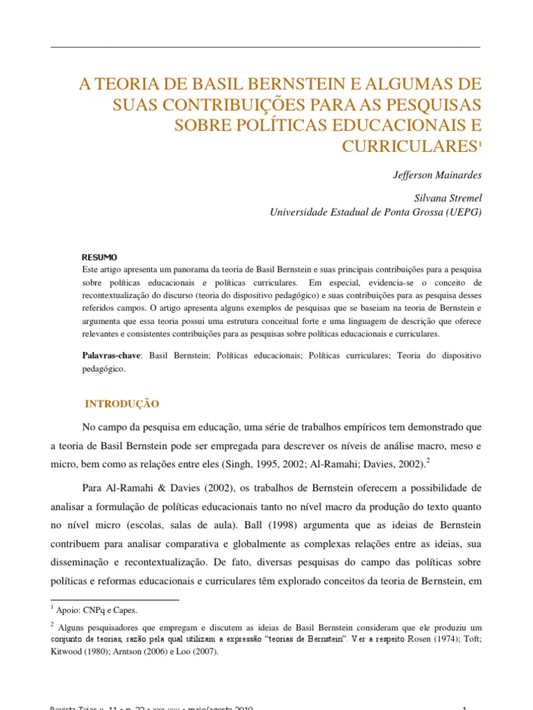 A TEORIA DE BASIL BERNSTEIN E ALGUMAS DE SUAS CONTRIBUIÇÕES PARA AS PESQUISAS SOBRE POLÍTICAS EDUCACIONAIS E CURRICULARES 1