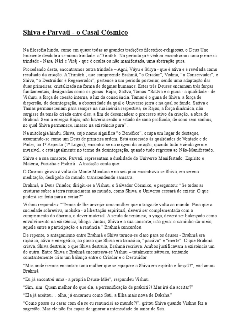 Na filosofia hindu, como em quase todas as grandes tradies filosfico-religiosas, o Deus Uno Imanente desdobra-se numa trindade: a Trimrti. No perodo pr-vdico encontramos uma primeira trindade - Nara, Nr e Virj - que oculta ou no manifestada, uma abstrao pura. Procedendo desta, encontramos outra trindade Agni, Vyu e Srya - que ativa e revelada como resultado da criao. A Trimrti , que compreende Brahm, o Criador, Vishnu, o Conservador, e Shiva, o Destruidor e Regenerador, pertence a um perodo posterior, sendo uma adaptao das duas primeiras, cristalizada na forma de dogmas humanos. Estes trs Deuses encarnam trs foras fundamentais, designadas como os gunas: Rajas, Sattva, Tamas. Sattva o guna - a qualidade - de Vishnu, a fora de coeso interna, a luz da conscincia. Tamas o guna de Shiva, a fora de disperso, de desintegrao, a obscuridade da qual o Universo jorra e na qual se funde. Sattva e Tamas permaneceriam para sempre na sua inrcia respectiva, se Rajas, a fora dinmica, no surgisse da tenso criada entre eles, a fim de desencadear o processo ativo da criao, a obra de Brahm. Sem a energia Rajas, no haveria seno o estado de sono profundo, de sono sem sonhos, no qual Shiva permanece, imerso na existncia pura . Na mitologia hindu, Shiva, cujo nome significa o Benfico, ocupa um lugar de destaque, assumindo-se como um Deus de primeira ordem. Est associado s qualidades de Vontade e de Poder, ao 1 Aspecto (1 Logos); encontra-se na origem da criao, quando tudo ainda germe invisvel, e est igualmente no termo da desintegrao, quando tudo regressa ao No-Manifestado. Shiva e a sua consorte, Parvati, representam a dualidade do Universo Manifestado: Esprito e Matria, Purusha e Prakriti . A tradio conta que: O Cosmos girava volta do Monte Mandara e no seu pico encontrava-se Shiva, em serena meditao, desligado do mundo, transcendendo samsara . Brahm, o Deus Criador, dirigiu-se a Vishnu, o Salvador Csmico, e perguntou: Se todas as criaturas sobre a terra renunciarem ao mundo, como Shiva, o Universo cessar de existir. O que poder ser feito para o evitar? Vishnu respondeu: Temos de lhe arranjar uma mulher que o traga de volta ao mundo. Para que a sociedade sobreviva, mokska - a libertao espiritual, dever ser complementada com o cumprimento do dharma, o dever material. A senda da renncia, o yoga, dever ser balanado como envolvimento na existncia, bhoga. Juntos, Shiva e a sua consorte, iro gerar o caminho-do-meio, aquele entre a participao e a renncia. Brahm concordou. De repente, o antagonismo entre Brahm e Shiva tornou-se claro para os deuses - Brahm era rajsico, ativo e energtico, ao passo que Shiva era tamsico, passivo e inerte. O que Brahm criava, Shiva destrua; o que Shiva destrua, Brahm recriava. Ambos justificavam a existncia um do outro. Entre Shiva e Brahm encontrava-se Vishnu totalmente sttvico, tentando constantemente criar um balano entre o Criador e o Destruidor. Mas onde iremos encontrar uma mulher que se equipare a Shiva em esprito e fora?!, exclamou Brahm. Eu j encontrei uma - a prpria Deusa-Me, respondeu Vishnu. Sim, sim. Quem melhor do que ela, a personificao de prakriti?! Mas ir ela aceitar? Ela j aceitou olha, j encarnou como Sati, a filha mais nova de Daksha. Como posso eu casar com ela se eu renunciei ao mundo?!, gritou Shiva quando Vishnu fez a sugesto. Mas ele no foi capaz de ignorar a intensidade do amor de Sati.