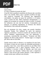 Porque queres tu casar comigo?, perguntou Shiva a Sati. Porque eu estou incompleta sem ti e tu ests incompleto sem mim. Mas eu no tenho nada para te oferecer. Eu no peo nada a no ser tu. A determinao de Sati impressionou Shiva, que a aceitou como sua consorte. Brahm e Vishnu rejubilaram. Daksha, o pai de Sati, o guardio da civilizao, no gostava de Shiva, pois este era um eremita que no vivia de acordo com as leis da civilizao. Um dia, Daksha tomou a iniciativa de realizar um prodigioso sacrifcio, para o qual seria convidada toda a criao, excepto Shiva e Sati. Apesar de Shiva ter tentado demover Sati, esta foi na mesma at casa do pai. Quando l chegou, junto do fogo sagrado estavam sbios, deuses, deusas, mas ningum se levantou para a cumprimentar; at o seu pai no se mostrou particularmente feliz por v-la. De repente, tudo se tornou claro: Sati apercebeuse que o sacrifcio era um elaborado ritual com o objetivo de denegrir o seu Senhor. A humilhao foi to grande que a morte pareceu a melhor alternativa. A notcia da morte de Sati deixou Shiva destroado e, ento, veio a dor. O Deus experienciou a angstia da separao e da solido e isolouse nas cavernas geladas dos Himalaias. A Deusa-Me, encarnao de toda a matria, nunca estvel, est constantemente num estado de fluxo. A sua morte foi apenas uma transformao. Sati iria retornar noutra forma. Os Deuses sabiam-no e Shiva tambm Nos Himalaias havia um rei chamado Hivamam, casado com a rainha Mena, que tinha uma belssima filha chamada Parvati ou Uma, filha das montanhas. Parvati era Sati reencarnada, e estava decidida a reconquistar o seu amado. E assim foi Perante o fogo sagrado, Shiva e Parvati procederam ao ritual que os consagrou marido e mulher e os tornou nas duas partes do Todo. Os dois completavam-se perfeitamente, existindo entre eles uma perfeita harmonia. Parvati era a pupila perfeita e Shiva o professor perfeito. Atravs das sagradas conversas entre eles, foram revelados os segredos dos Vedas, o esplendor dos Shastras (5), e o mundo foi enriquecido. O Cosmos rejubilou. Com Parvati ao seu lado, Shiva fez uma declarao ao mundo: Que se saiba, nenhuma adorao ou sacrifcio ser aceite pelos deuses enquanto um homem no tiver a esposa ao seu lado. Aquele que se afasta das alegrias e das tristezas da vida, em vez de lidar com elas, um tolo, pois est a fugir da Verdade. Aquele que obcecado pelos prazeres e pelas dores da vida, incapaz de avistar a serenidade por detrs dela, um tolo, pois ele tambm est fugindo da Verdade. Ambos disseram: A Verdade encontra-se na harmonia entre o esprito e a matria, entre o corpo, a mente e alma, entre o individual e o social, entre a sociedade e a natureza, entre Purusha e Prakriti. Ana Isabel Neves
