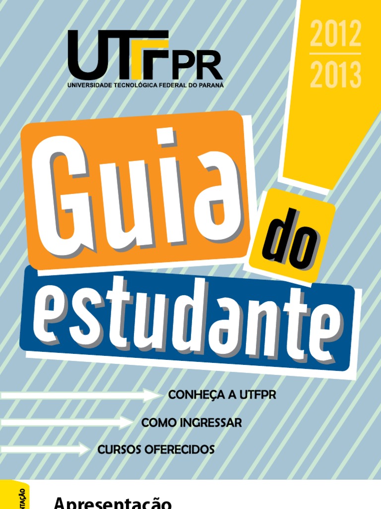 Se voc est procurando um curso, do ensino mdio ao doutorado, abriu a revista certa. O Guia do Estudante da UTFPR apresenta aos nossos futuros alunos o que a Universidade Tecnolgica pode lhes oferecer em seus 12 cmpus. So vrias possibilidades em cursos tcnicos (integrados ao ensino mdio e subsequente), cursos superiores de tecnologia, bacharelados, formao de professores, licenciaturas, especializaes, mestrados e doutorados. E no s isso! A Instituio possibilita uma formao completa, em que o aluno tem a possibilidade de se envolver em atividades de ensino, pesquisa e extenso. Os alunos da UTFPR tambm podem aprender uma nova lngua, praticar esportes, danar, cantar, fazer teatro, realizar intercmbios e estgios, desenvolver projetos tecnolgicos, de empreendedorismo e inovao... Ufa! Para saber mais, s comear a folhear este guia e acessar o Portal da UTFPR ([Link]). Boa leitura!