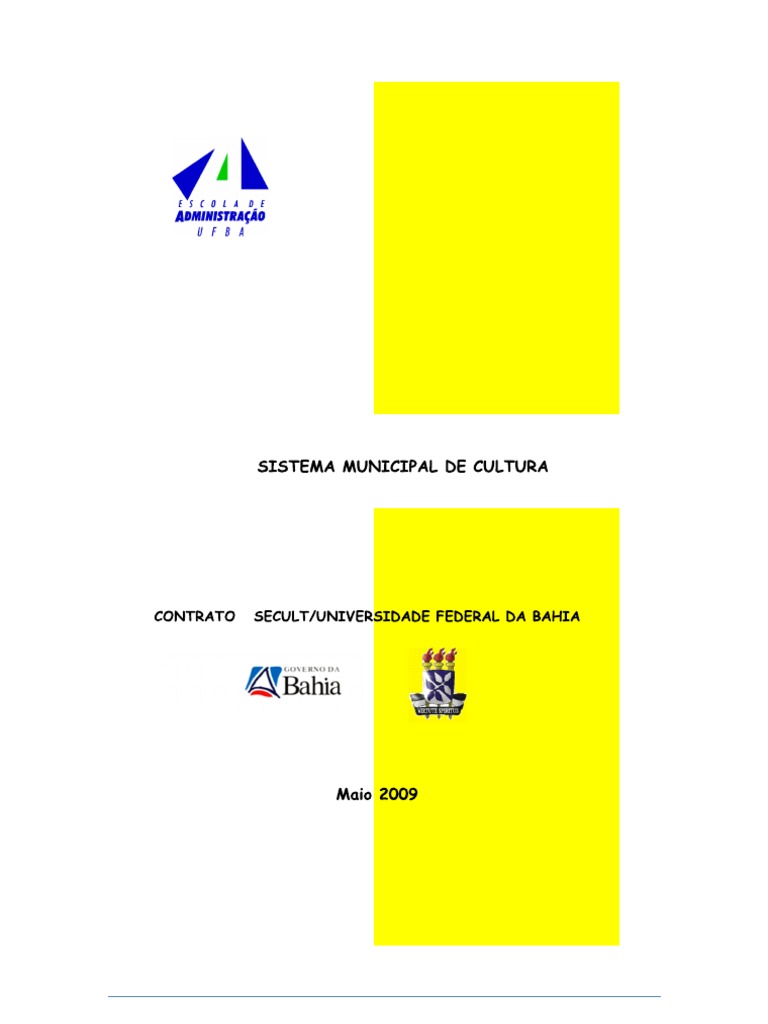 Nesse sentido, como mais uma ao concreta para implementao do Sistema Estadual de Cultura, a SECULT firmou uma parceria institucional com a UFBA, para esta, atravs de sua Escola de Administrao, prestar servios de assessoramento e assistncia tcnica, inicialmente a 100 municpios baianos, objetivando a organizao e o fortalecimento do Sistema Municipal de Cultura. Este trabalho de consultoria ser liderado pela Superintendncia de Cultura, rgo centralizado da SECULT, com apoio de seus tcnicos, e a execuo do servio dar-se- atravs de professores e consultores da EAUFBA. Para o fiel cumprimento dos objetivos pactuados entre as duas instituies parceiras, foi previsto, a cargo da Consultoria, o desenvolvimento das seguintes atividades: Sensibilizar o poder legislativo municipal para o relevante papel Assessorar e apoiar as municipalidades na constituio e Colaborar na estruturao, fortalecimento e/ou implementao