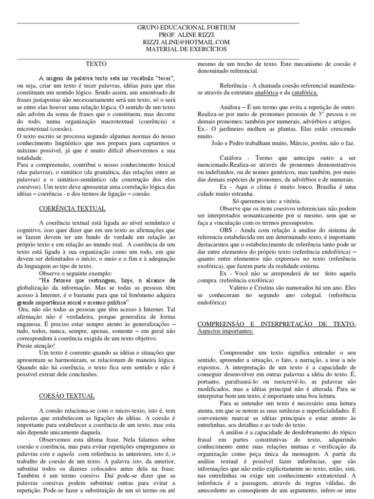 Este mecanismo de coeso denominado referencial. A origem da palavra texto est no vocbulo tecer, ou seja, criar um texto tecer palavras, idias para que elas Referncia - A chamada coeso referencial manifestaconstituam um sentido lgico. Sendo assim, um amontoado de se atravs da estrutura anafrica e da catafrica. frases justapostas no necessariamente ser um texto, s o ser se entre elas houver uma relao lgica. O sentido de um texto Anfora um termo que evita a repetio de outro. no advm da soma de frases que o constituem, mas decorre Realiza-se por meio de pronomes pessoais de 3 pessoa e os do todo, numa organizao macrotextual (coerncia) e demais pronomes; tambm por numerais, advrbios e artigos. microtextual (coeso). Ex.- O jardineiro molhou as plantas. Elas esto crescendo O texto escrito se processa segundo algumas normas do nosso muito. conhecimento lingstico que nos prepara para captarmos o Joo e Pedro trabalham muito, Mrcio, porm, no o faz. mximo possvel, j que muito difcil absorvermos a sua totalidade. Catfora - Termo que antecipa outro a ser Para a compreenso, contribui o nosso conhecimento lexical mencionado.Realiza-se atravs de pronomes demonstrativos (das palavras), o sinttico (da gramtica, das relaes entre as ou indefinidos, ou de nomes genricos, mas tambm, por meio palavras) e o sinttico-semntico (da construo dos elos das demais espcies de pronomes, de advrbios e de numerais. coesivos). Um texto deve apresentar uma correlao lgica das Ex - Aqui o clima muito louco. Braslia uma idias coerncia - e dos termos de ligao coeso. cidade muito estranha. S queremos isto: a vitria. COERNCIA TEXTUAL Observe que os itens coesivos referenciais no podem ser interpretados semanticamente por si mesmo, sem que se A coerncia textual est ligada ao nvel semntico e faa a vinculao com os termos pressupostos. cognitivo, isso quer dizer que em um texto as afirmaes que OBS - Ainda com relao analise do sistema de se fazem devem ter um fundo de verdade em relao ao referencia estabelecida em um determinado texto, importante prprio texto e em relao ao mundo real. A coerncia de um destacarmos que o estabelecimento de referncia tanto pode se texto est ligada sua organizao como um todo, em que dar entre elementos do prprio texto (referncia endofrica) devem ser delimitados o incio, o meio e o fim e adequao quanto entre elementos no expressos no texto (referncia da linguagem ao tipo de texto. exofrica), que fazem parte da realidade externa. Observe o seguinte exemplo: Ex - Voc no se arrepender de ter feito aquela H fatores que restringem, hoje, o alcance da compra. (referncia exofrica) globalizao da informao. Mas se todas as pessoas tm Valrio e Cristina so namorados h um ano. Eles acesso Internet, o bastante para que tal fenmeno adquira se conheceram no segundo ano colegial. (referncia grande importncia social e mesmo poltica. endofrica) Ora, no so todas as pessoas que tm acesso Internet. Tal afirmao no verdadeira, porque generaliza de forma enganosa. preciso estar sempre atento s generalizaes COMPREENSO E INTERPRETAO DE TEXTOtudo, todos, nunca, sempre, apenas, somente em geral no Aspectos importantes: correspondem coerncia exigida de um texto objetivo. Preste ateno! Um texto coerente quando as idias e situaes que Compreender um texto significa entender o seu apresentam se harmonizam, se relacionam de maneira lgica. sentido, apreender a situao, o fato, a narrao, a tese a ns Quando no h coerncia, o texto fica sem sentido e no expostos. A interpretao de um texto a capacidade de possvel extrair dele concluses. conseguir desenvolver em outras palavras a idia do texto. , portanto, parafrase-lo ou reescrev-lo, as palavras so modificados, mas a idias principal no alterada. Para se COESO TEXTUAL interpretar bem um texto, importante uma boa leitura. Para se entender um texto necessrio uma leitura A coeso relaciona-se com o micro-texto, isto , tem atenta, em que se notem as suas sutilezas e superficialidades. palavras que estabelecem as ligaes de idias. A coeso conveniente marcar as idias principais e estar atento s importante para estabelecer a coerncia de um texto, mas esta entrelinhas, aos detalhes e ao todo do texto. no depende unicamente daquela. A anlise a capacidade de desdobramento do tpico Observemos esta ltima frase. Nela falamos sobre frasal em partes constitutivas do texto, adquirindo coeso e coerncia, mas para evitar repeties empregamos as conhecimento entre suas relaes mutuas e verificao da palavras esta e aquela com referncia s anteriores, isto , o organizao como pea nica da mensagem. A partir da trabalho de coeso de um texto. A palavra isto, da anterior, anlise textual possvel fazer inferncias, que so substitui todos os dizeres colocados antes dela na frase. informaes que no esto explicitamente no texto, esto, sim, Tambm um termo coesivo. Da pode-se dizer que as nas entrelinhas ou exige um conhecimento extratextual. A palavras coesivas podem substituir outras para evitar a inferncia a passagem, atravs de regras vlidas, do repetio. Pode-se fazer a substituio de um s termo ou at antecedente ao conseqente de um argumento, infere-se uma 1