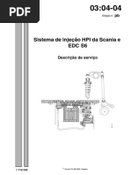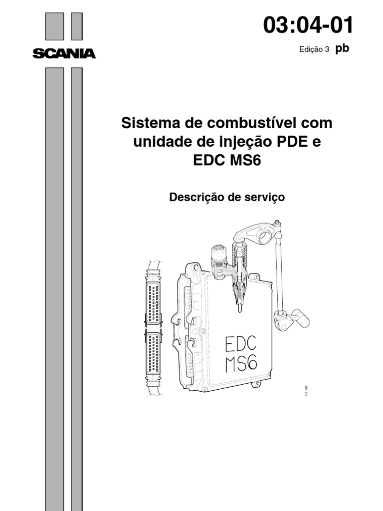 IMPORTANTE! A unidade de comando poder ser danificada se continuar a receber tenso enquanto est sendo desconectada. A ignio deve, por isso, ser desligada com a chave de partida (arranque) e a lmpada indicadora do EDC apagada antes de remover a unidade de comando. 1 Desconecte os dois conectores (fichas) da unidade de comando. 2 Remova os parafusos de segurana da unidade de comando e em seguida a unidade de comando. 3 Limpe a superfcie de contato no radiador da unidade de comando. Nota: As roscas no radiador sero deformadas se apertar os parafusos da unidade de comando a um torque (binrio) maior que 22 Nm. 4 Instale a unidade de comando nova e aperte os parafusos a 22 Nm. 5 Conecte os dois conectores (fichas) na unidade de comando. 6 Efetue a programao necessria com o Scania Programmer. 7 Ligue o motor. Verifique e em seguida apague os cdigos de falha (avaria) com o Scania Diagnos.