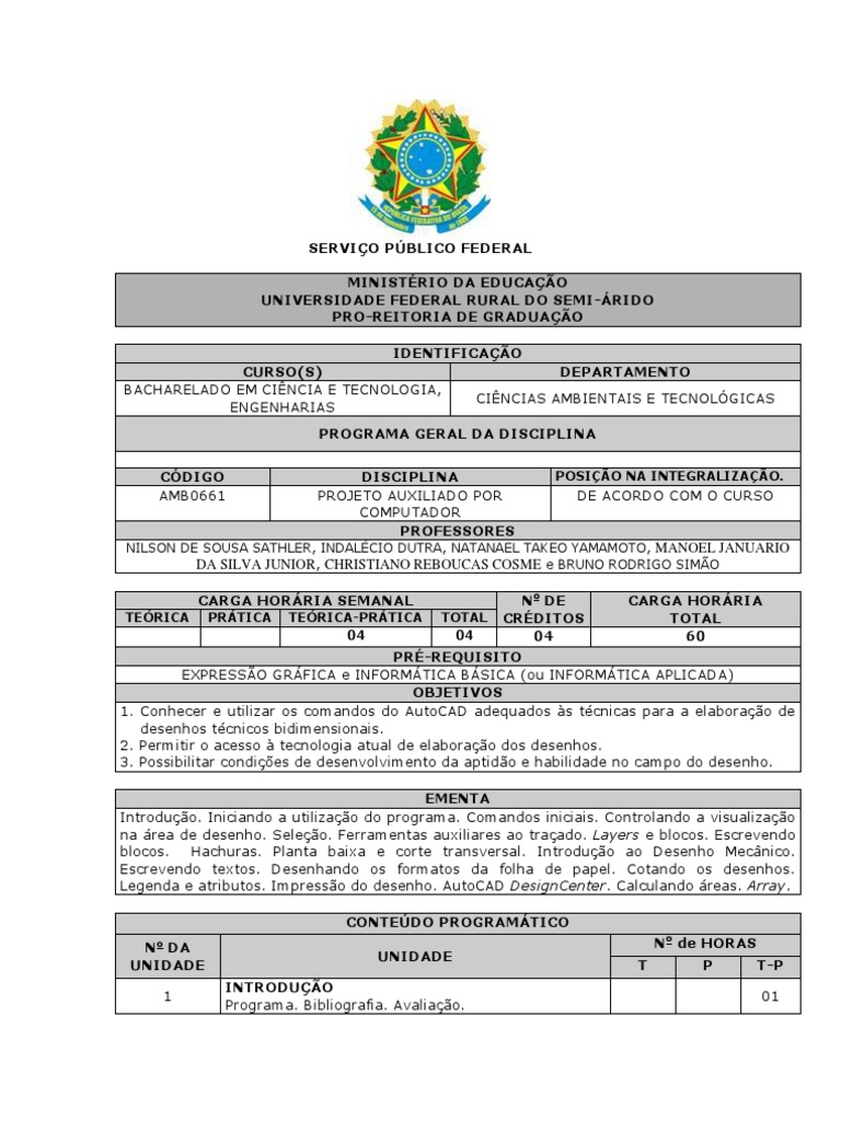 EM CINCIA E TECNOLOGIA, CINCIAS AMBIENTAIS E TECNOLGICAS ENGENHARIAS PROGRAMA GERAL DA DISCIPLINA CDIGO AMB0661 DISCIPLINA PROJETO AUXILIADO POR COMPUTADOR PROFESSORES