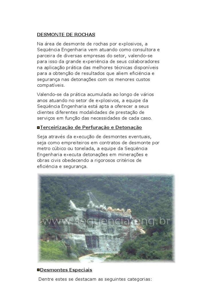 empresas do setor, valendo-se para isso da grande experincia de seus colaboradores na aplicao prtica das melhores tcnicas disponveis para a obteno de resultados que aliem eficincia e segurana nas detonaes com os menores custos compatveis. Valendo-se da prtica acumulada ao longo de vrios anos atuando no setor de explosivos, a equipe da Seqncia Engenharia est apta a oferecer a seus clientes diferentes modalidades de prestao de servios em funo das necessidades de cada caso. Terceirizao de Perfurao e Detonao Seja atravs da execuo de desmontes eventuais, seja como empreiteiros em contratos de desmonte por metro cbico ou tonelada, a equipe da Seqncia Engenharia executa detonaes em mineraes e obras civis obedecendo a rigorosos critrios de eficincia e segurana.
