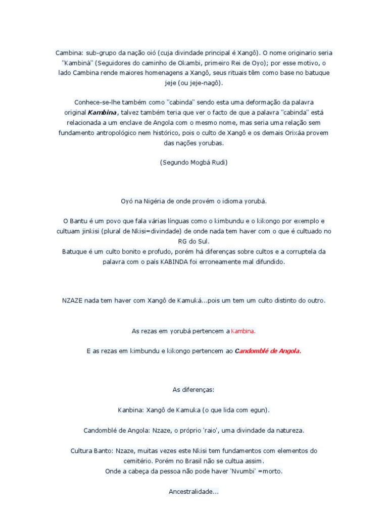 Plural de NKISI pode ser tambm, akixi, mukixi (que no livro Clyde W. Ford, O heri com rosto africano na pgina 62 descrito assim: Makishi plural de 'kishi' que em Bantu significa monstro ou ogre que come gente, as vezes descrito como multicfalo e capaz de regenerar suas cabeas decepadas. BLOG com equvoco sobre KAMBINA: [Link] O pas Kabinda, que tem a predominncia de culto Bantu nada tem haver com a forma de cultura e liturgia praticada no RG do sul erroneamente denominada Kabinda. Est havendo uma confuso grande de assimilao do que Bantu com a Cabinda (do sul ). Justificar uma origem apenas por causa do pas pode trazer grandes confuses nas cabeas das pessoas. Cabinda do sul kanbina. No Rio Grande do Sul a raiz forte da 'Cambina' foi o Pai Waldemar Antonio dos Santos, filho do Orix Xang Kamuk Barulofina, que foi feito pelo africano Gululu de Xang.
