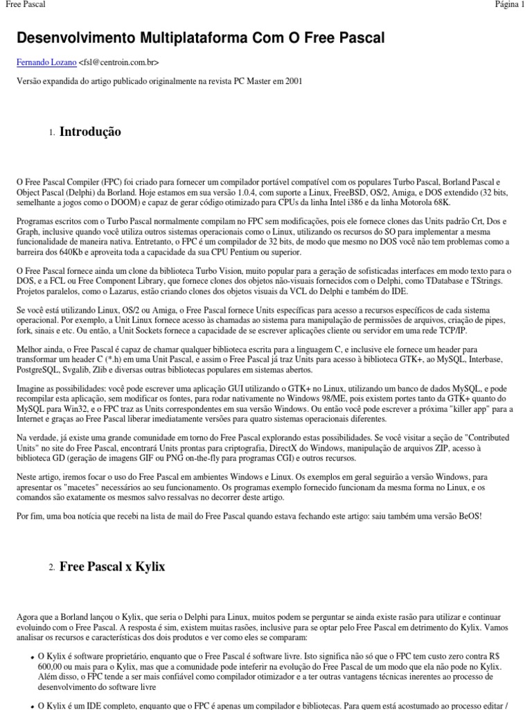 Agora que a Borland lanou o Kylix, que seria o Delphi para Linux, muitos podem se perguntar se ainda existe raso para utilizar e continuar evoluindo com o Free Pascal. A resposta sim, existem muitas rases, inclusive para se optar pelo Free Pascal em detrimento do Kylix. Vamos analisar os recursos e caractersticas dos dois produtos e ver como eles se comparam: O Kylix software proprietrio, enquanto que o Free Pascal software livre. Isto significa no s que o FPC tem custo zero contra R$ 600,00 ou mais para o Kylix, mas que a comunidade pode inteferir na evoluo do Free Pascal de um modo que ela no pode no Kylix. Alm disso, o FPC tende a ser mais confivel como compilador otimizador e a ter outras vantagens tcnicas inerentes ao processo de desenvolvimento do software livre O Kylix um IDE completo, enquanto que o FPC apenas um compilador e bibliotecas. Para quem est acostumado ao processo editar / compilar / depurar na linha de comando do Unix, isto no problema, mas para aqueles habituados aos ambientes de desenvolvimento do
