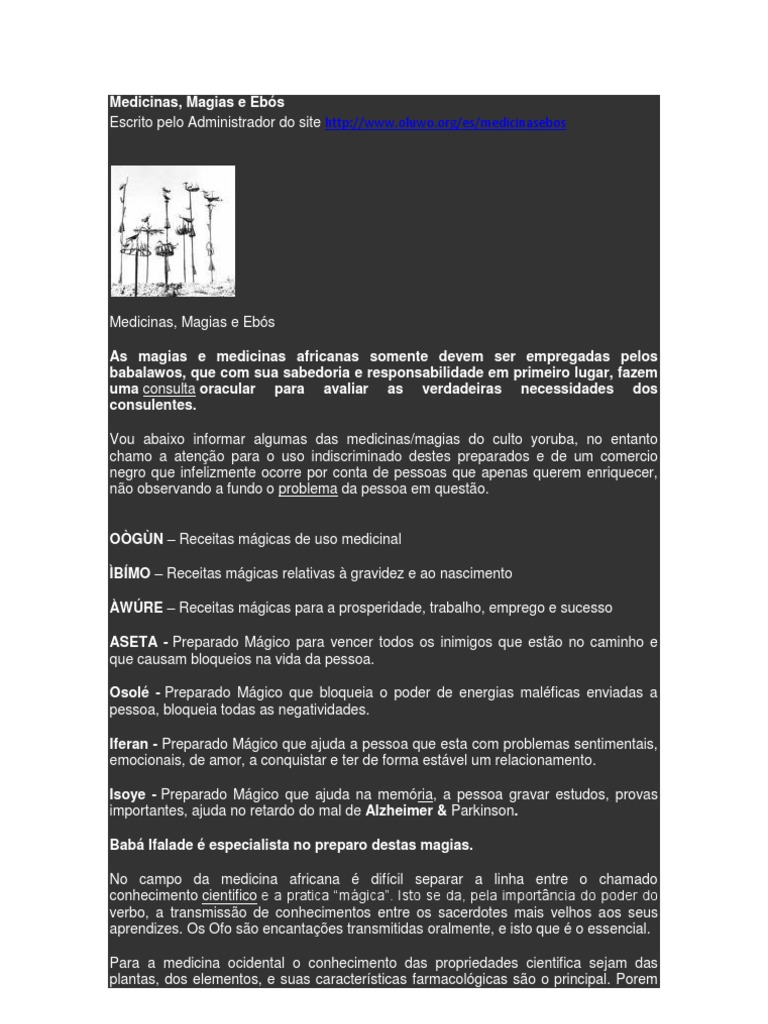 Medicinas, Magias e Ebs As magias e medicinas africanas somente devem ser empregadas pelos babalawos, que com sua sabedoria e responsabilidade em primeiro lugar, fazem uma consulta oracular para avaliar as verdadeiras necessidades dos consulentes. Vou abaixo informar algumas das medicinas/magias do culto yoruba, no entanto chamo a ateno para o uso indiscriminado destes preparados e de um comercio negro que infelizmente ocorre por conta de pessoas que apenas querem enriquecer, no observando a fundo o problema da pessoa em questo. OGN Receitas mgicas de uso medicinal BMO Receitas mgicas relativas gravidez e ao nascimento WRE Receitas mgicas para a prosperidade, trabalho, emprego e sucesso ASETA - Preparado Mgico para vencer todos os inimigos que esto no caminho e que causam bloqueios na vida da pessoa. Osol - Preparado Mgico que bloqueia o poder de energias malficas enviadas a pessoa, bloqueia todas as negatividades. Iferan - Preparado Mgico que ajuda a pessoa que esta com problemas sentimentais, emocionais, de amor, a conquistar e ter de forma estvel um relacionamento. Isoye - Preparado Mgico que ajuda na memria, a pessoa gravar estudos, provas importantes, ajuda no retardo do mal de Alzheimer & Parkinson. Bab Ifalade especialista no preparo destas magias. No campo da medicina africana difcil separar a linha entre o chamado conhecimento cientifico e a pratica mgica. Isto se da, pela importncia do poder do verbo, a transmisso de conhecimentos entre os sacerdotes mais velhos aos seus aprendizes. Os Ofo so encantaes transmitidas oralmente, e isto que o essencial. Para a medicina ocidental o conhecimento das propriedades cientifica sejam das plantas, dos elementos, e suas caractersticas farmacolgicas so o principal. Porem