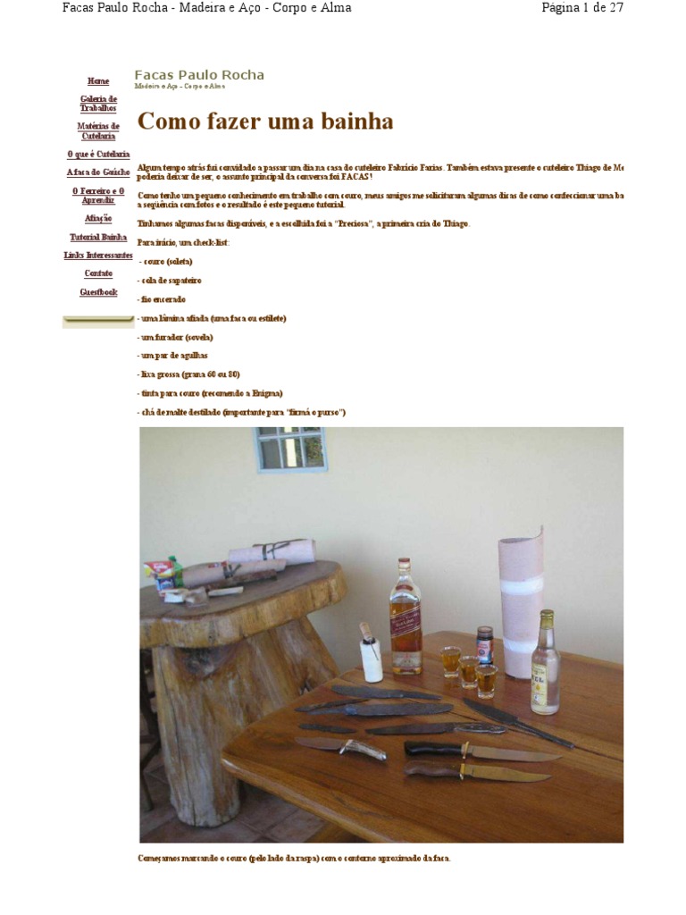 Como tenho um pequeno conhecimento em trabalho com couro, meus amigos me solicitaram algumas dicas de como confeccionar uma bainha. Registramos a seqncia com fotos e o resultado este pequeno tutorial. Tinhamos algumas facas disponveis, e a escolhida foi a Preciosa, a primeira cria do Thiago. Para incio, um check-list: - couro (soleta) - cola de sapateiro - fio encerado - uma lmina afiada (uma faca ou estilete) - um furador (sovela) - um par de agulhas - lixa grossa (grana 60 ou 80) - tinta para couro (recomendo a Enigma) - ch de malte destilado (importante para firm o purso)