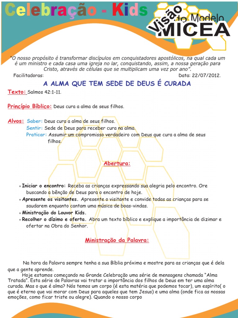 precisamos: 1. Ele louvou a Deus.levantaiemcristo. Pessoas que estão com a sua alma doente são sempre críticas nada está bom para elas. Ele esperou em Deus e confiou plenamente em Deus.Orar entregando tudo para Deus. mas existe cura para alma doente! Você quer saber como? Rosto feliz – Para curar a alma ferida e ficar feliz como esse rosto. Esta pessoa estava com a alma machucada? Muitas vezes ficamos tristes quando algo de ruim acontece conosco e ficamos como esse rosto triste. mas ele tomou essas 4 atitudes para curar a sua alma: Ele orou a Deus.. Como podemos machucar a nossa alma? Quando acontece algo muito ruim com a gente.Louvar a Deus por todas as situações.Confie de todo seu coração em Deus.br e www.visaomicea. Essa pessoa do Salmos 42 que lemos estava muito triste. só pensam o pior.. conversar com Ele. Depois peça a elas pintarem o desenho com guache colorido.br . Reforço: Oriente as crianças a encontrar no desenho as crianças que estão felizes por estarem com a alma curada no Senhor. 3. deixe que Ele cure a sua alma. Se entregue a Jesus. Prepare o recurso RED como indicado e vire o rosto da figura conforme a indicação do texto a seguir. Rosto triste – Leia Salmos 42:1 a 11 com as crianças.Esperar em Deus.com. ministrando sobre a vida de cada uma delas. Momento com Deus: Ore por cada criança. entregue sua vida para Ele. Como estava a pessoa que escreveu este texto da Bíblia? Triste.fica doente é só irmos ao médico para ficarmos bom.com. Seja sensível à direção do Espírito Santo para conduzir esse momento.. Deus abençoe sua ministração! Apóstola Jaqueline Pinto Diretora do MECLe Apóstolos: Roni Von e Jaqueline Pinto Site: www. Você precisa de Deus. 2.. mas e quando a alma fica doente o que fazemos? Só Jesus pode curar a nossa alma. dizendo tudo a Ele. mas nunca colocam em prática. pedem conselhos. 4.