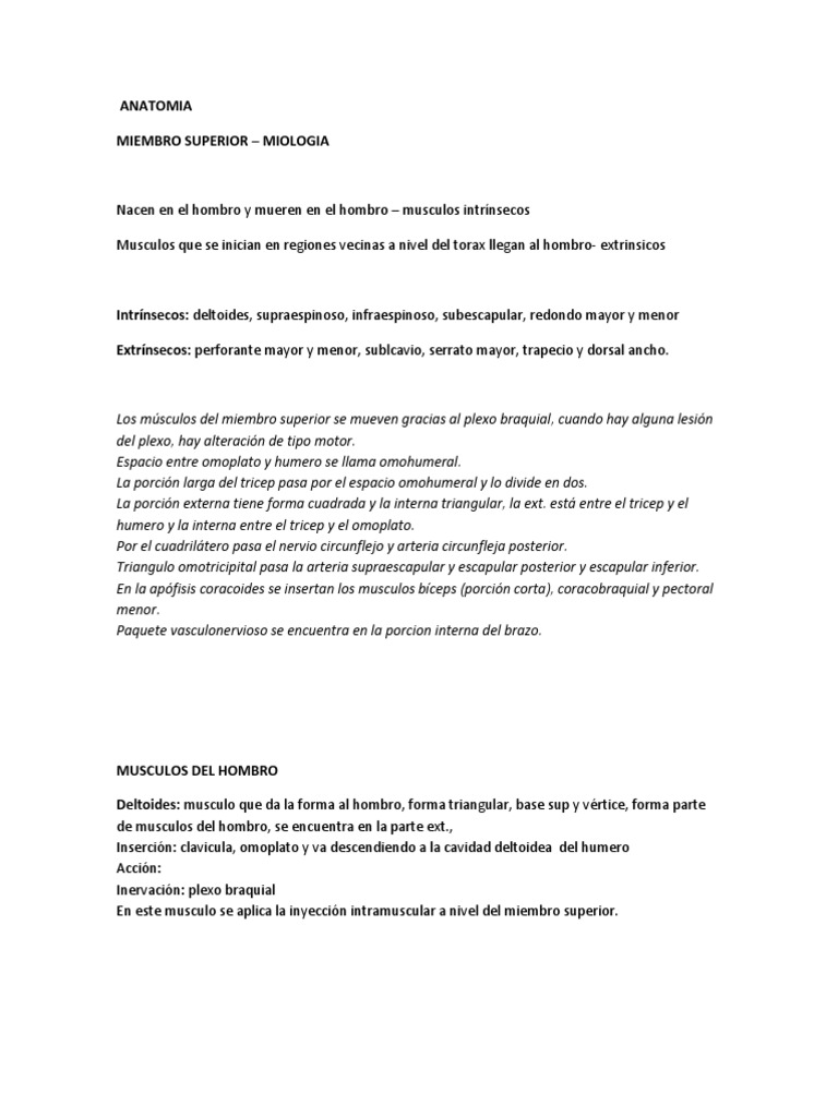 Los músculos del miembro superior se mueven gracias al plexo braquial, cuando hay alguna lesión del plexo, hay alteración de tipo motor. Espacio entre omoplato y humero se llama omohumeral. La porción larga del tricep pasa por el espacio omohumeral y lo divide en dos. La porción externa tiene forma cuadrada y la interna triangular, la ext. está entre el tricep y el humero y la interna entre el tricep y el omoplato. Por el cuadrilátero pasa el nervio circunflejo y arteria circunfleja posterior. Triangulo omotricipital pasa la arteria supraescapular y escapular posterior y escapular inferior. En la apófisis coracoides se insertan los musculos bíceps (porción corta), coracobraquial y pectoral menor. Paquete vasculonervioso se encuentra en la porcion interna del brazo.