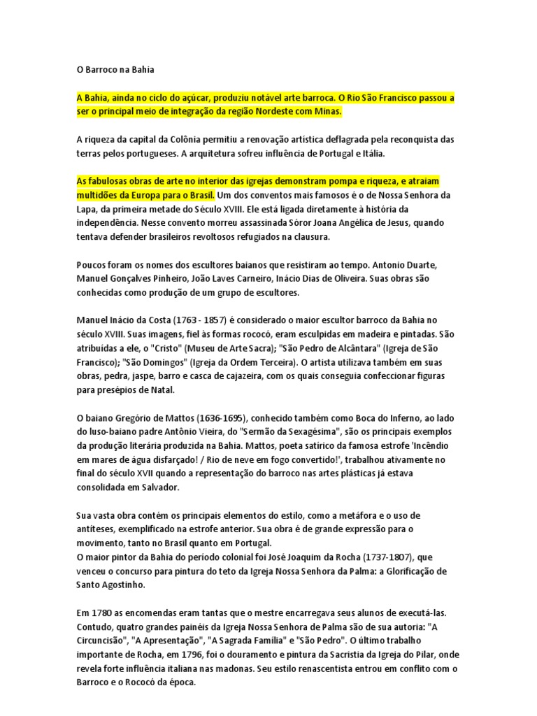 O Barroco na Bahia A Bahia, ainda no ciclo do acar, produziu notvel arte barroca.